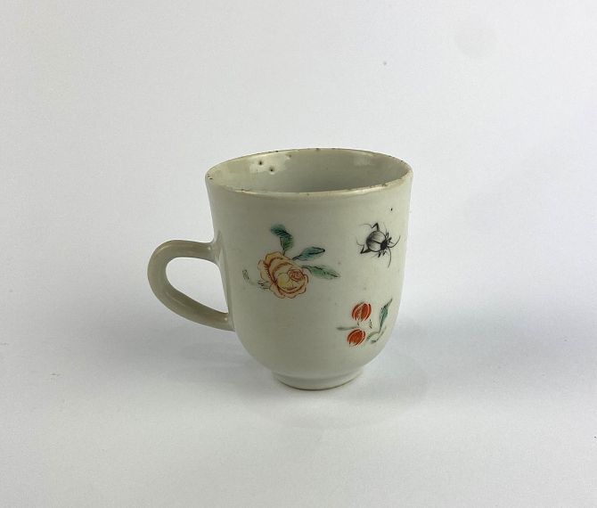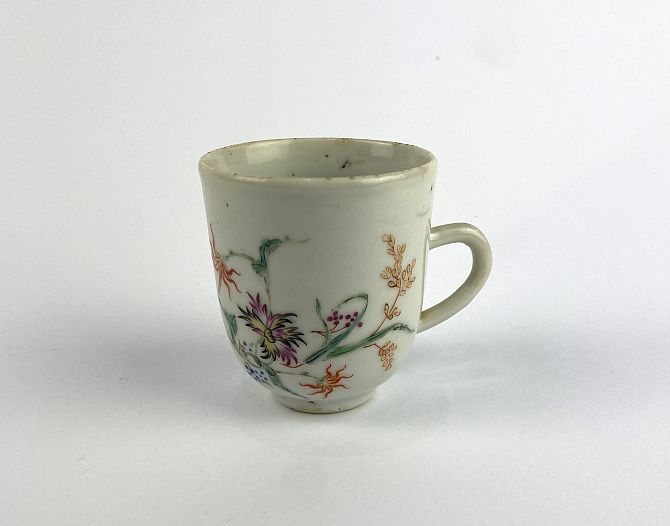 An 18th century Chinese porcelain cup, painted in coloured enamels with floral sprays, c.1770, 7cm high.