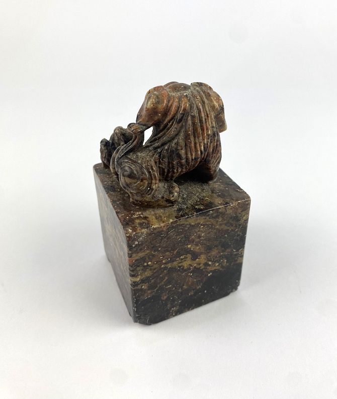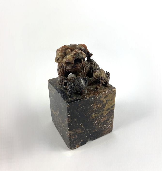 A Chinese carved soap stone seal, 18th/ 19th century, carved in the form of fo dog ad two smaller fo dogs, height 9.5cm (AF)