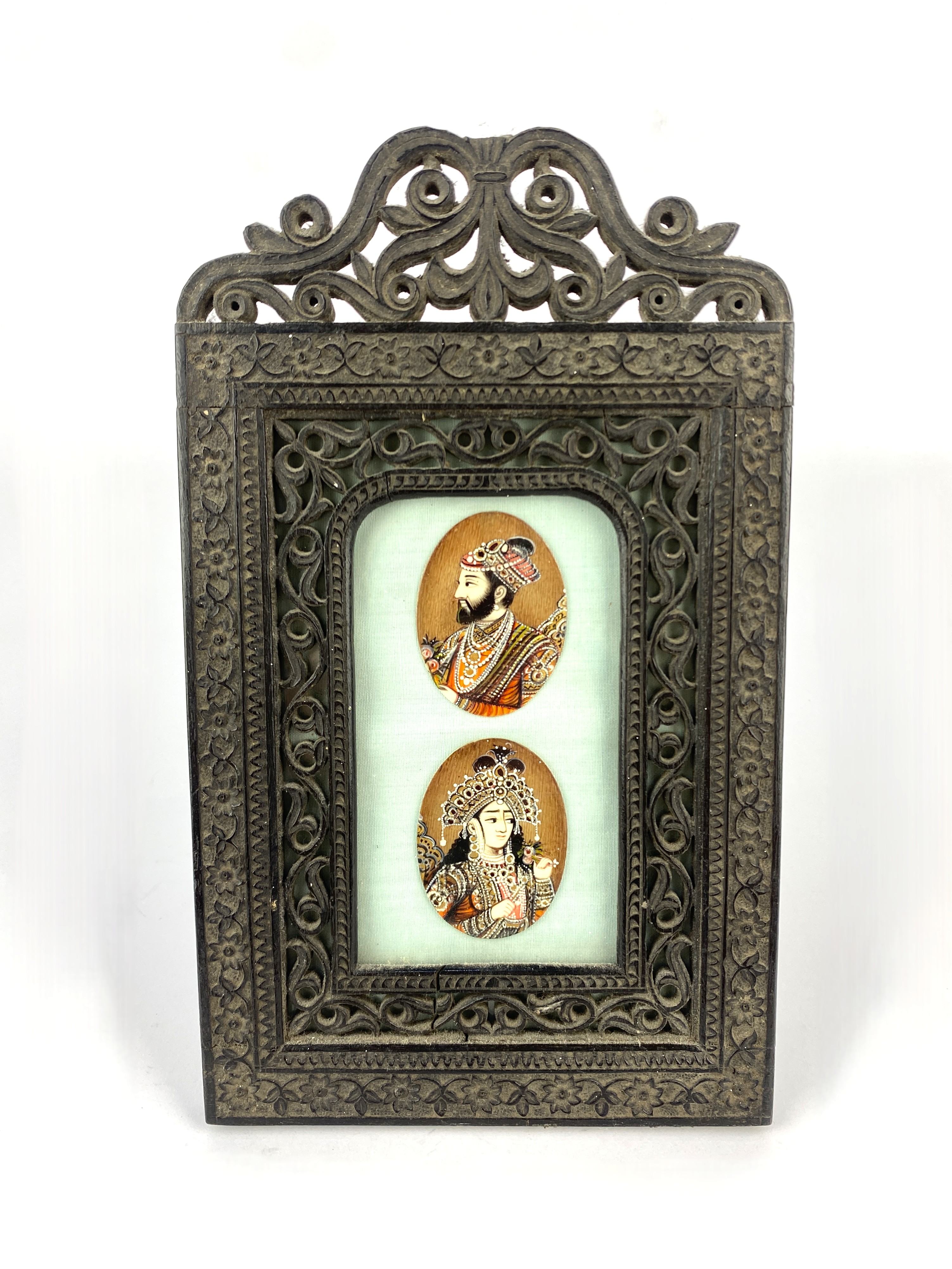 A pair of Persian hand painted oval portrait miniatures, each one 5cm by 4cm, displayed within a profousely carved and pierced wooden frame with easal stand, 23.5cm high.