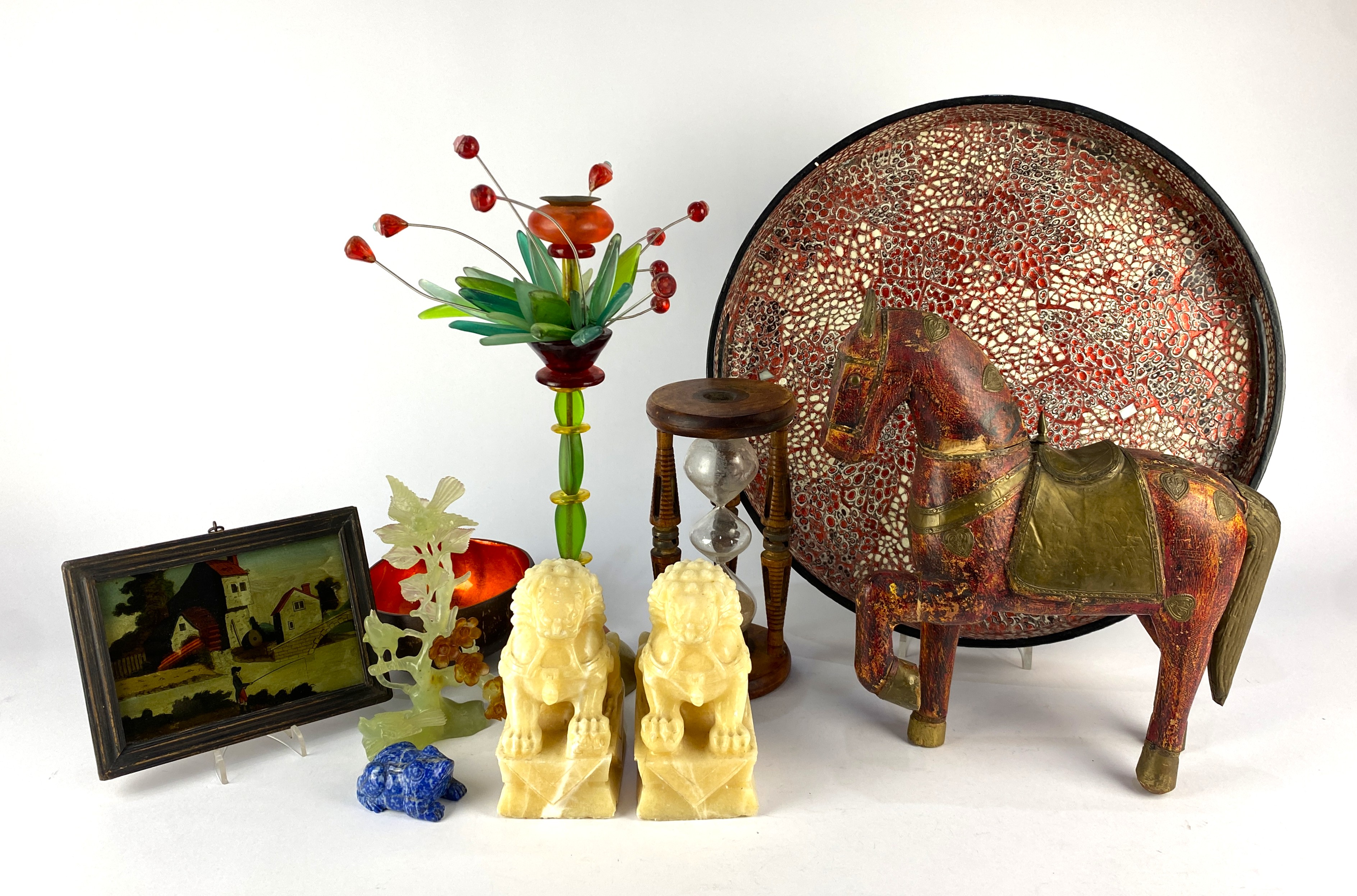 Mixed Collectables: comprising a pair of Chinese carved stone temple lions, 15cm high, a jade type carved model depicting birds amongst blossoms, 18cm high, a reverse glass miniature picture depicting a fisherman beside a watermill, 10cm by 14.5cm, an hour glass sand timer made from a wooden bobbin, 21cm high, a contemporary 'Love Coco' bowl, 14cm wide, a carved lapis lazuli model of a frog, 7cm long, a contemporary 'Lalo' candle holder, 35cm high, a metal mounted carved wooden model of a horse, 30cm high, and a contemporary enamel decorated circular tray, 40cm diameter, (10).