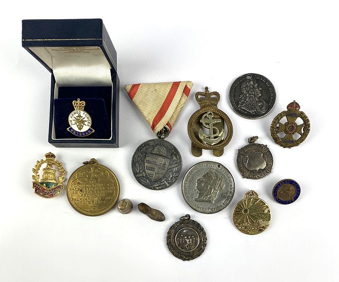 A silver medallion commemorating The Coronation of King George the First 1714 [pierced with a hole], a sterling silver fob medallion, a gold thimble charm and a group of badges and awards