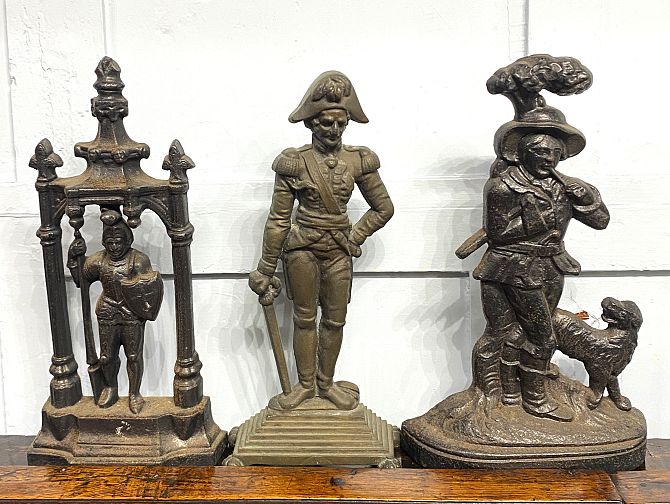 Three vintage cast iron figurative door stops, 41cm, 39cm, and 38cm high, (3).