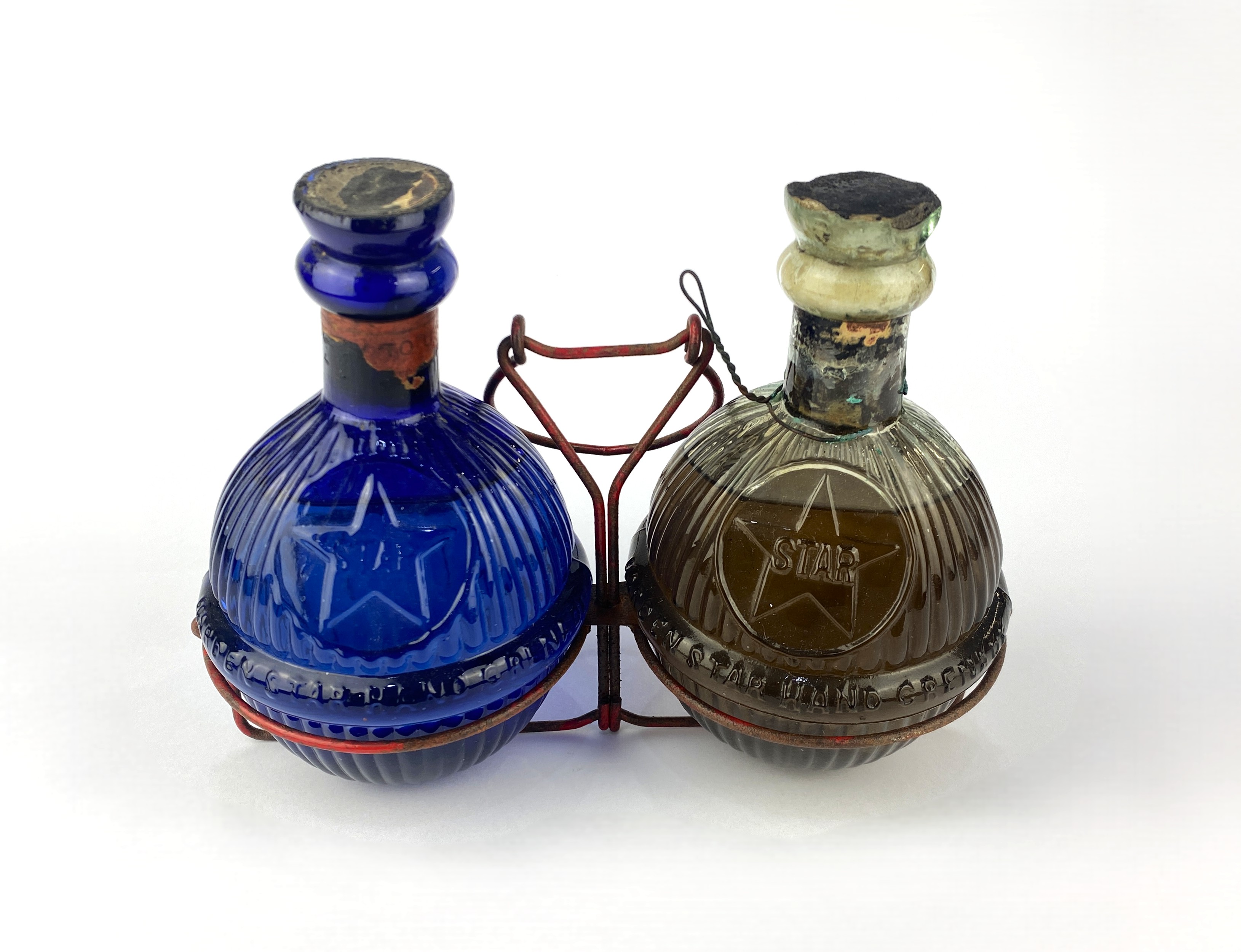 Two 19th century Harden Star glass hand grenade fire extinguishers, sealed and with original contents and on fitted metal stand, 24cm wide combined, (af).
