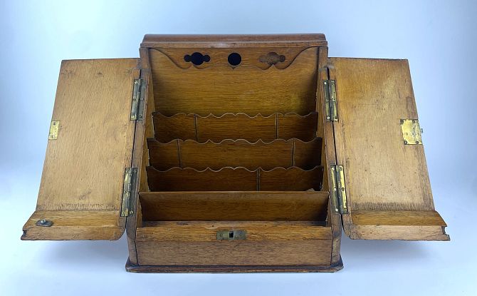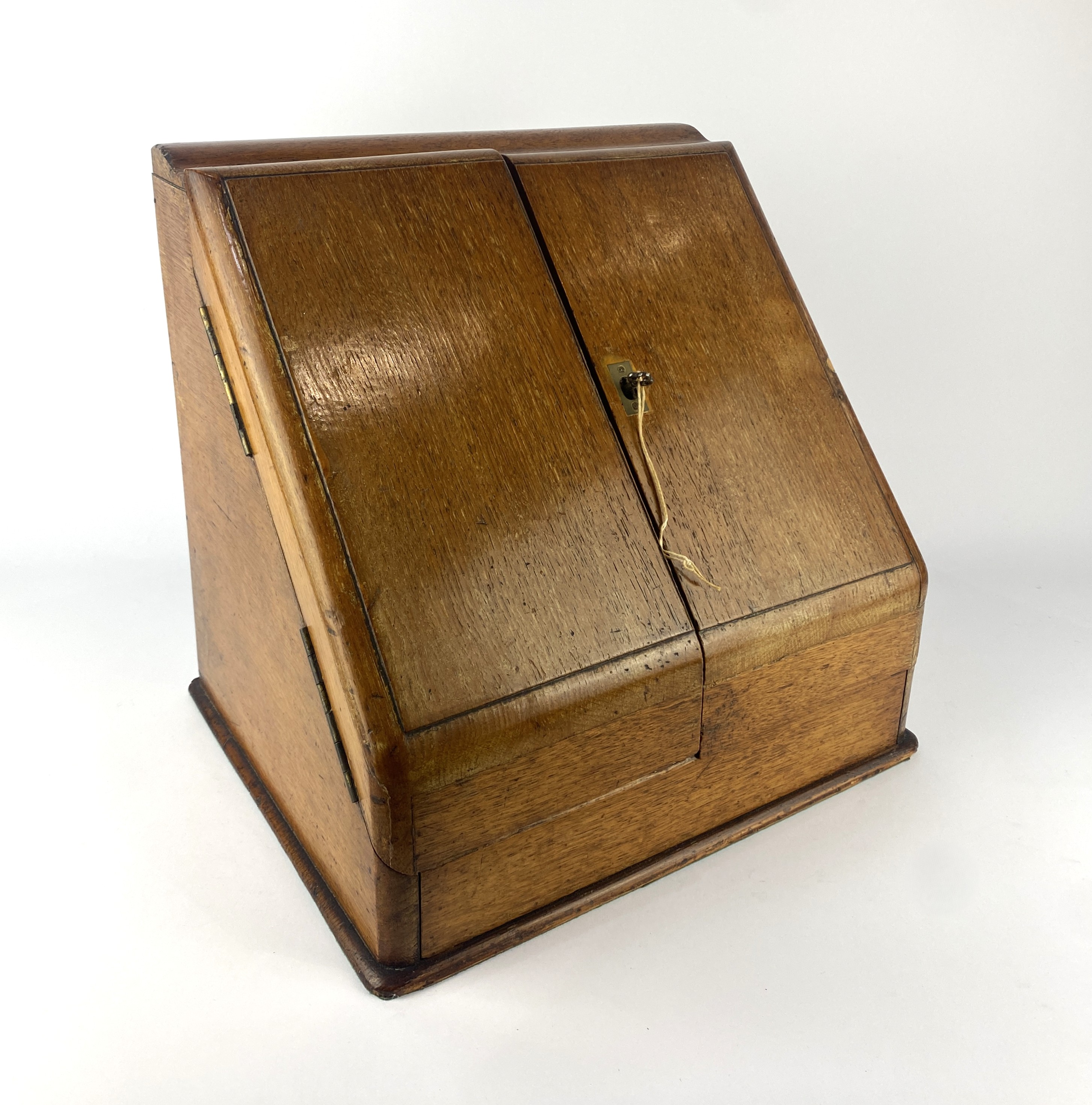 A late 19th / early 20th century oak stationery box, the sloping front with two hinged doors opening to reveal a letter rack and single drawer, height 31cm, width 32cm, depth 26cm, with key
