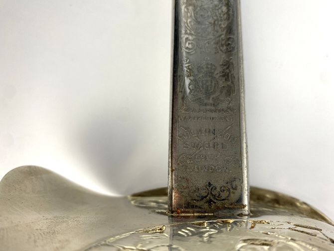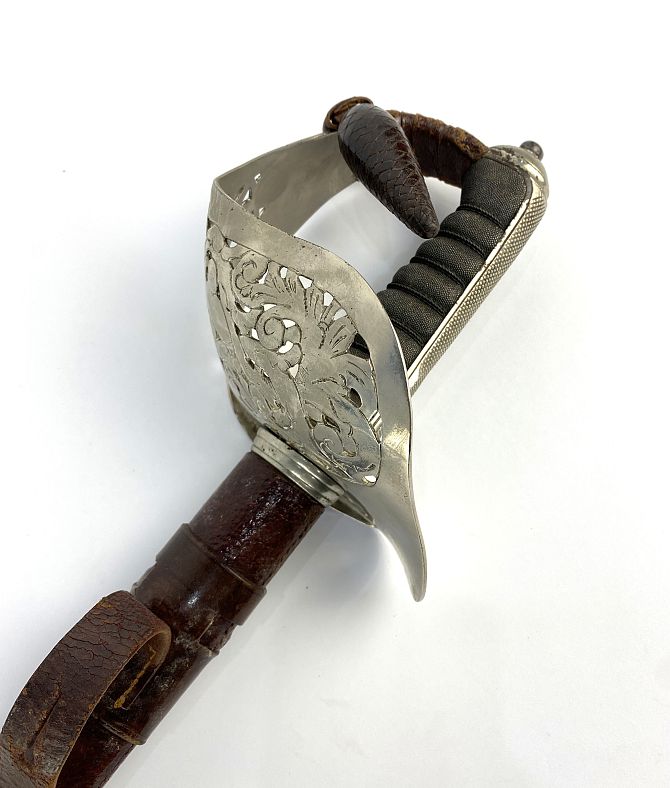 A George V dress sword with engraved blade, shark skin handle and pierced guard, brown leather scabbard and travelling case, blade 82cm long