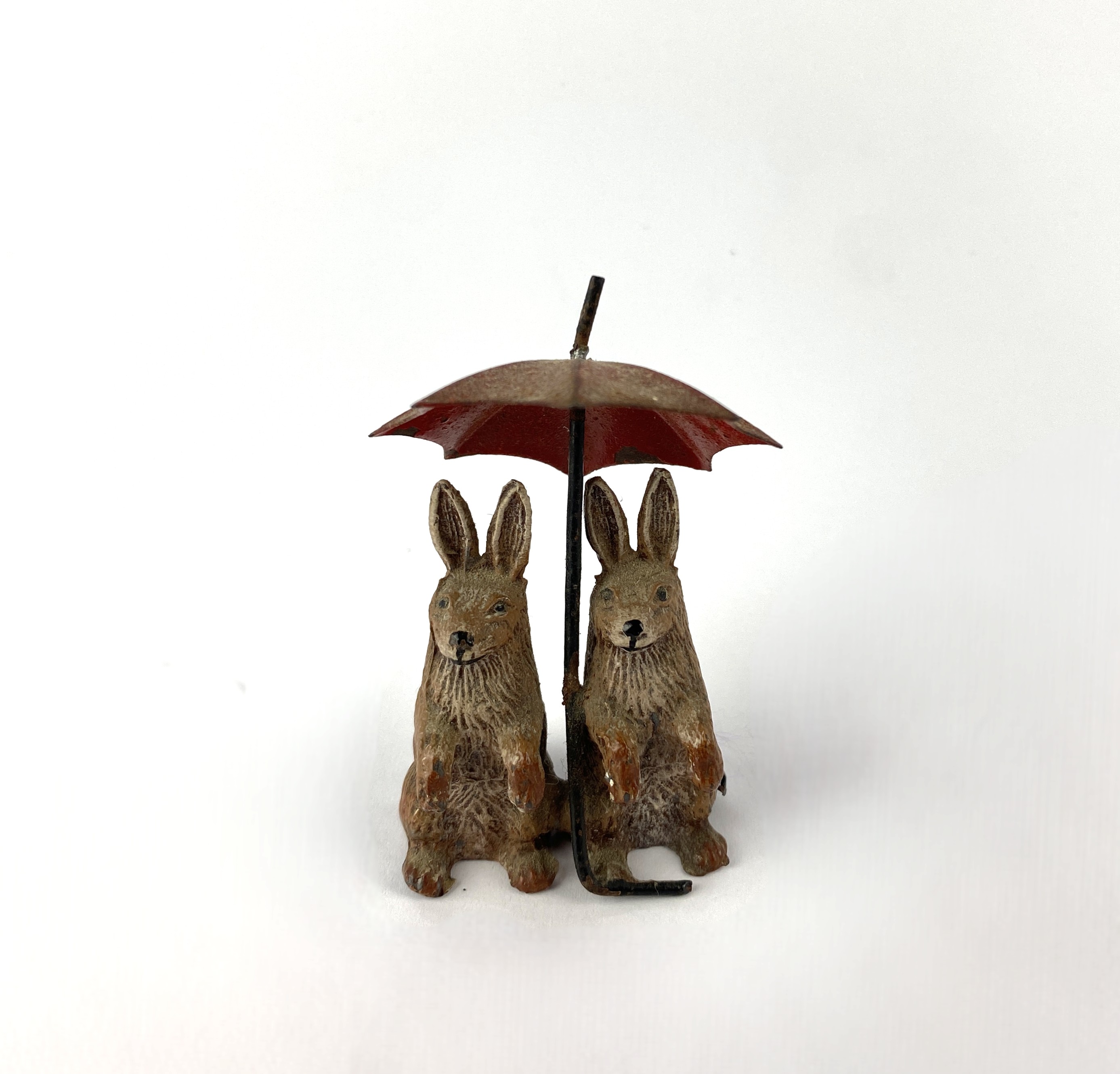 A small painted lead model of two rabbits holding an umbrella, unmarked, 7.5cm high