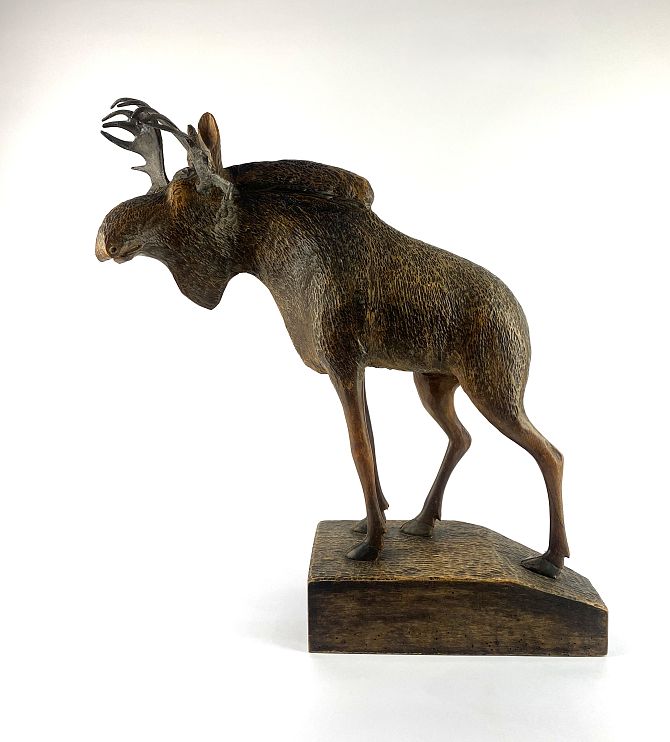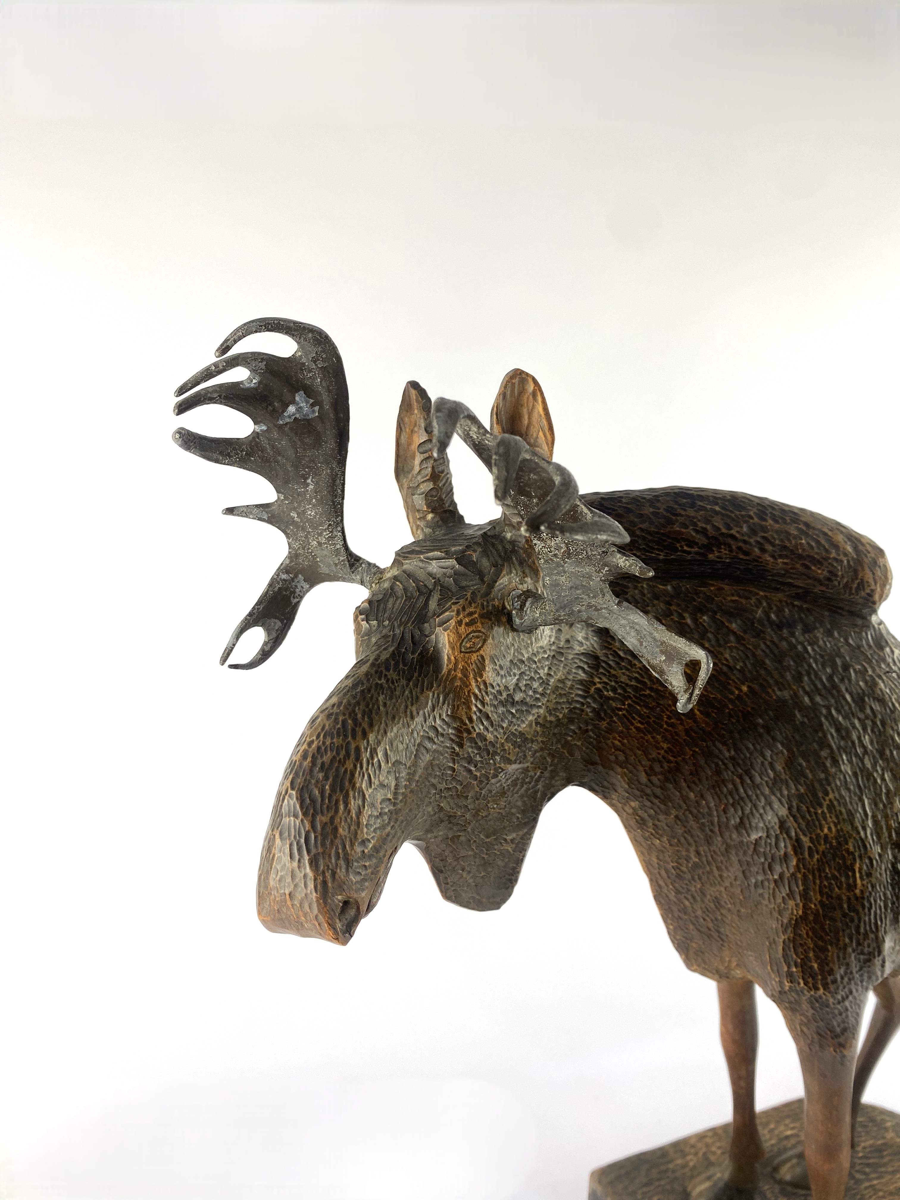 A vintage carved wooden sculpture of a moose with metal antlers, unsigned, 56cm high (a/f)