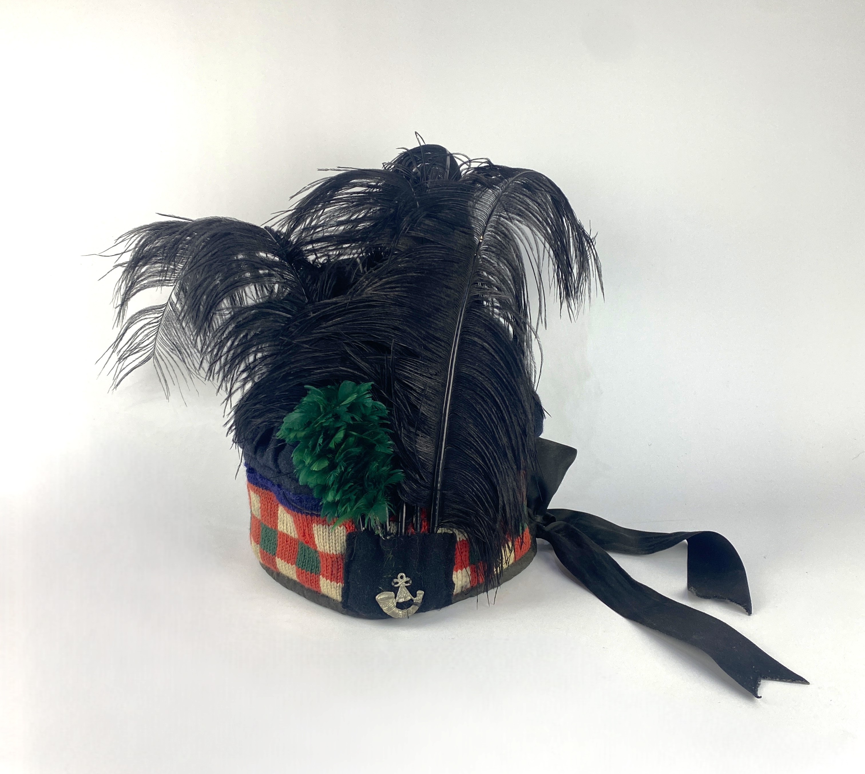 A vintage Scottish regimental bonnett, with knitted checked/ diced band and wool upper, red brocade lining, black tie, bearing Light Infantry cap badge, height overall 40cm