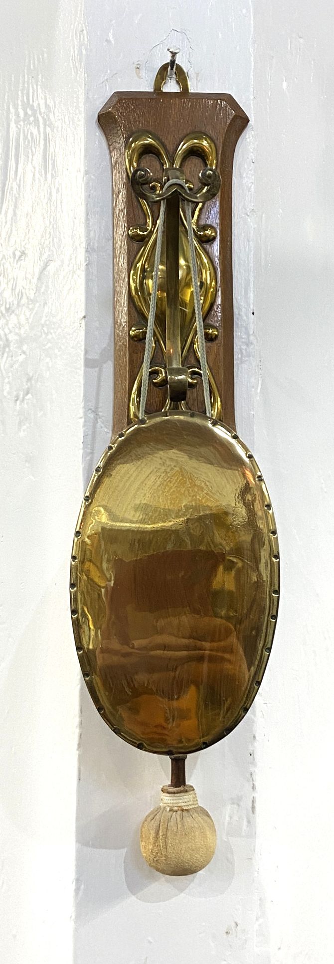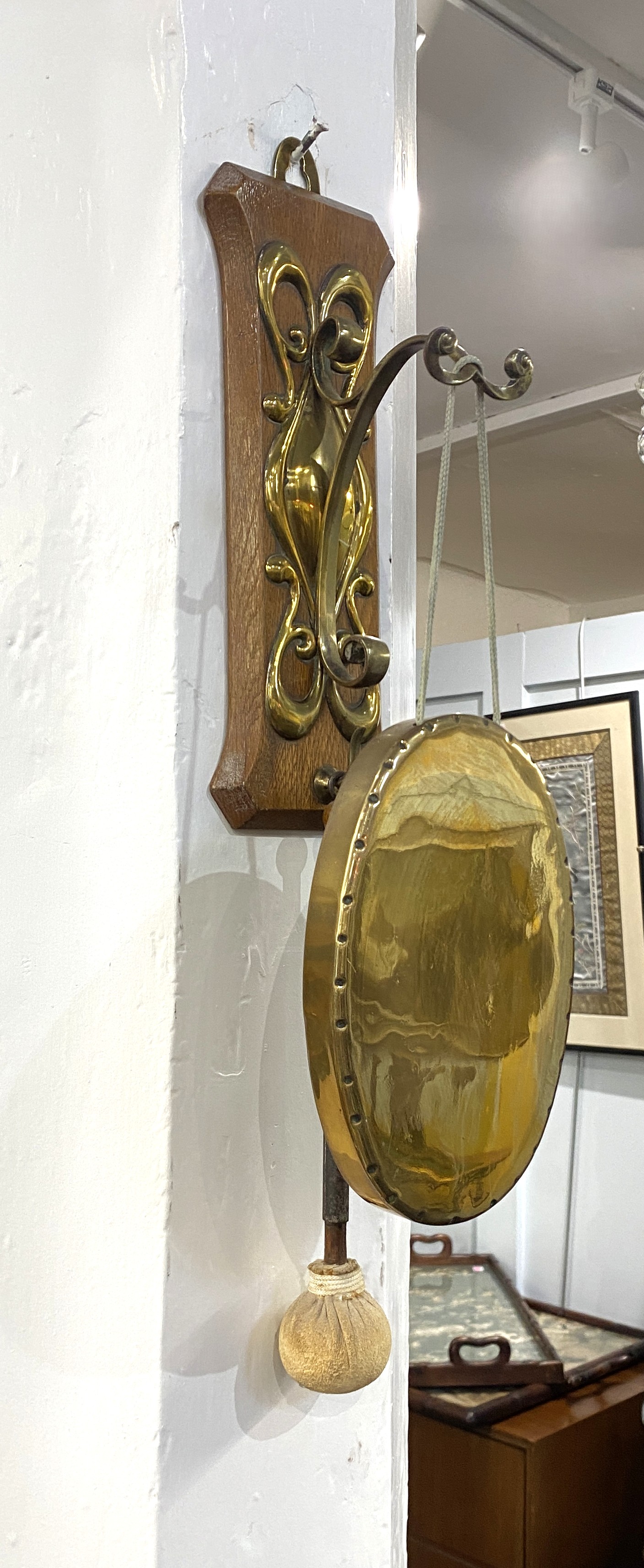 An Art Nouveau style wall mounted brass gong on oak plaque, with clanger, plaque 25cm by 10.5cm