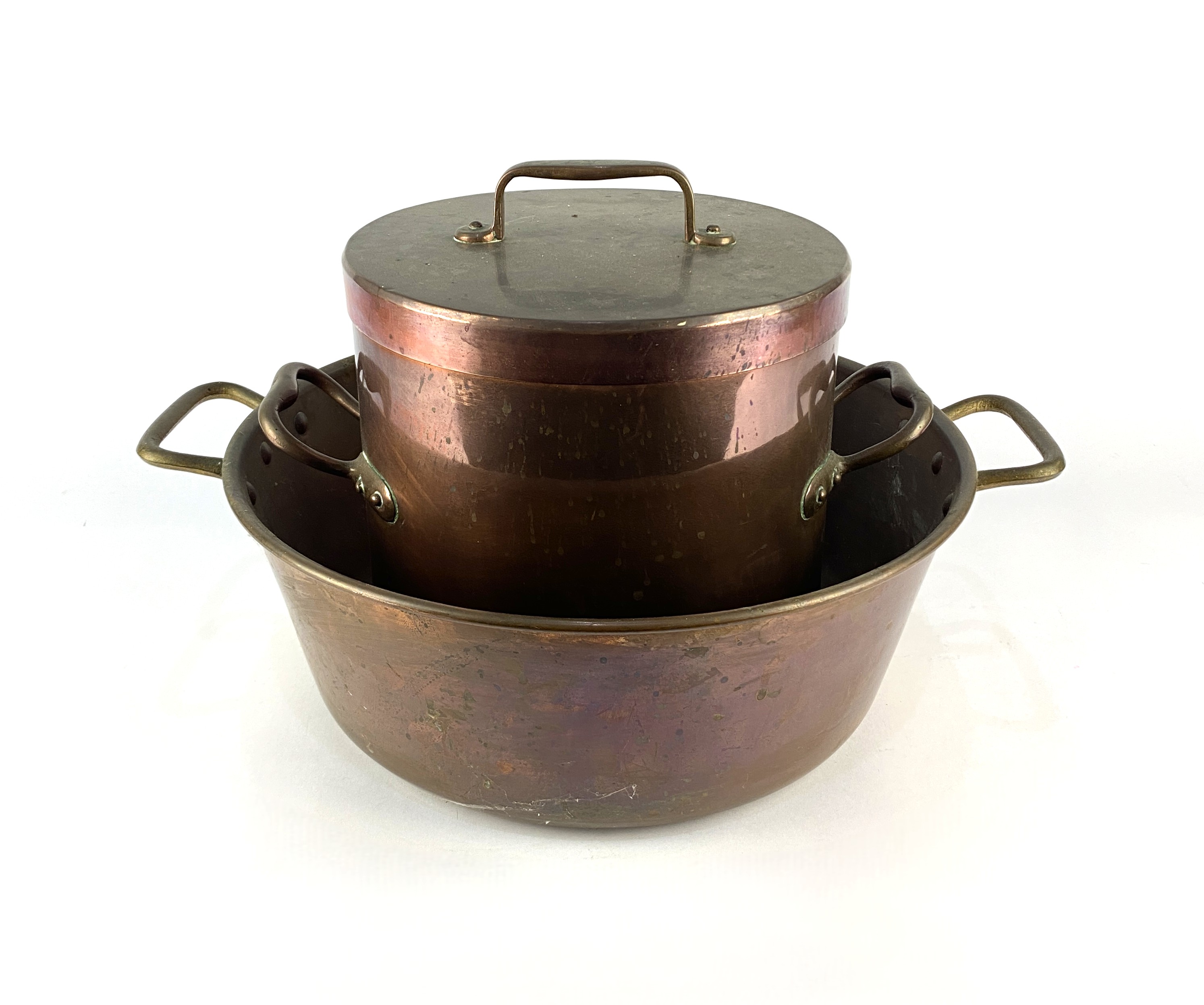 A 19th century copper twin handled cooking pot with lid, 28.5cm to top of lid handle, together with a copper twin handled preserve pan, 46cm wide to edge of handles, (2).