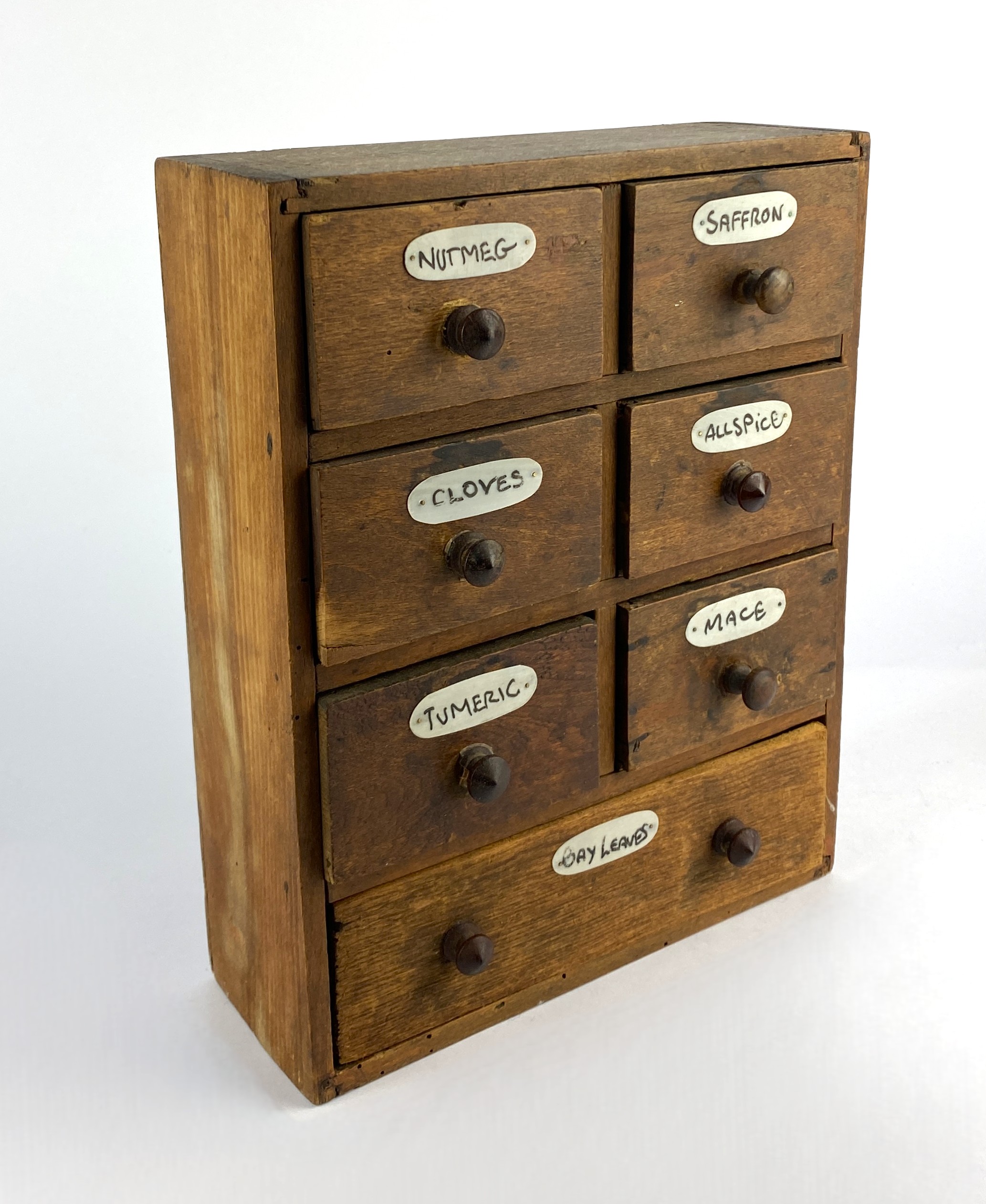 A vintage wooden spice chest, the seven drawers applied with name plaques and turned knob handles, 28cm high by 22.5cm wide by 9cm deep.