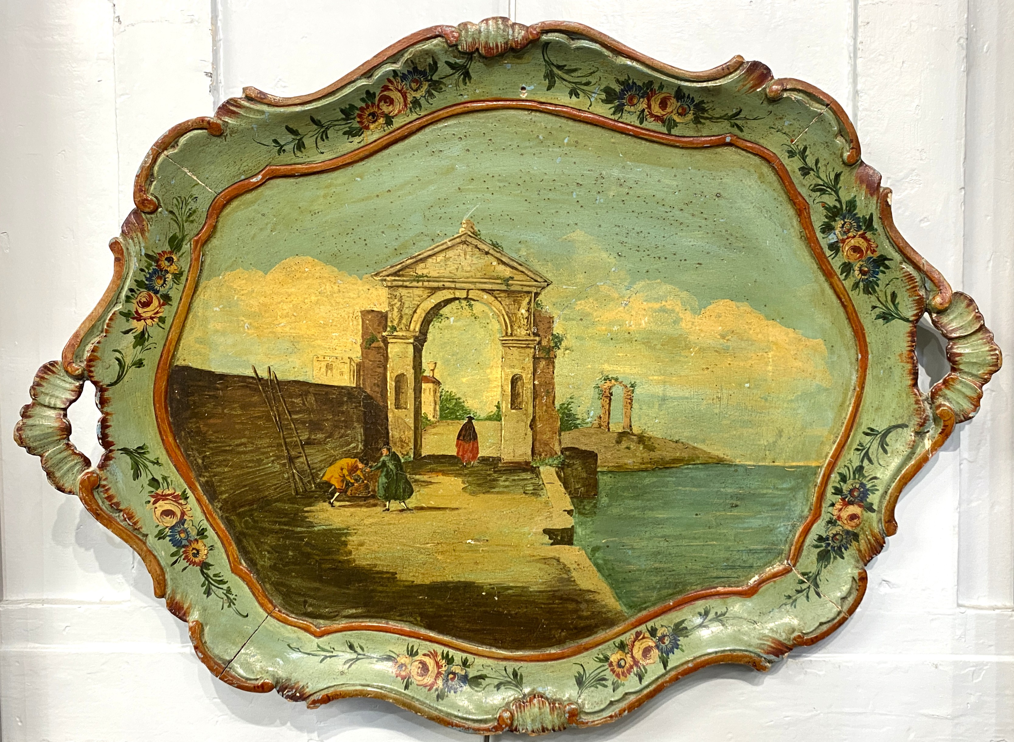 An Italian painted wooden tray decorated with a coastal view of figure walking beneath an arch, turquoise ground, mounted for wall display, 46cm by 61cm