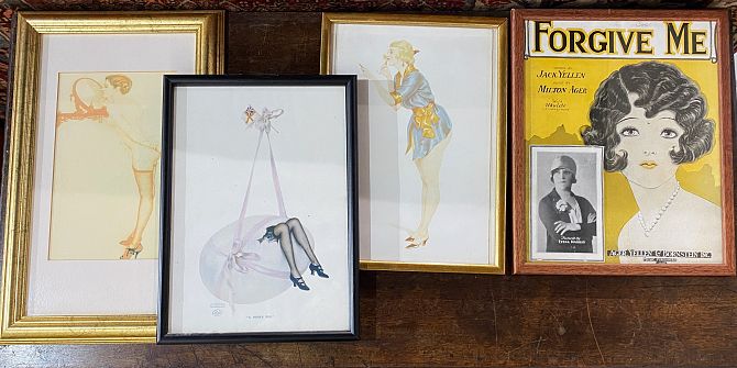A vintage Art Deco sheet music cover 'Forgive Me', framed, together with three Art Deco style prints, framed, (4).