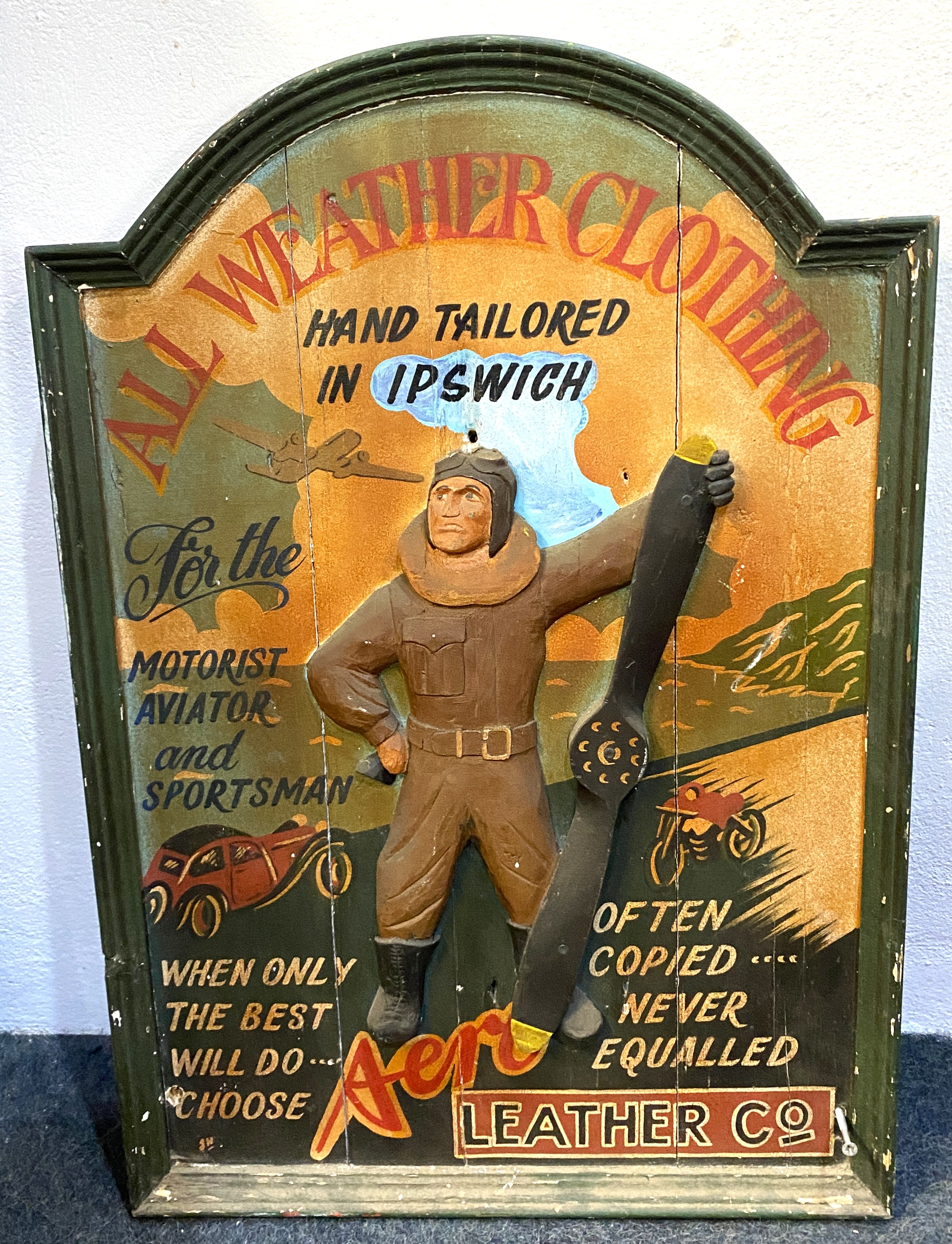 A painted vintage style wooden advertising sign for Aero Leather Co, with applied carved motif of a pilot holding a propeller, 82cm by 56cm