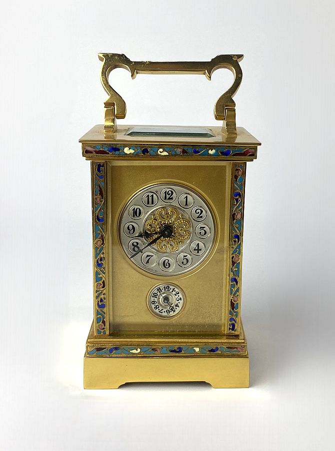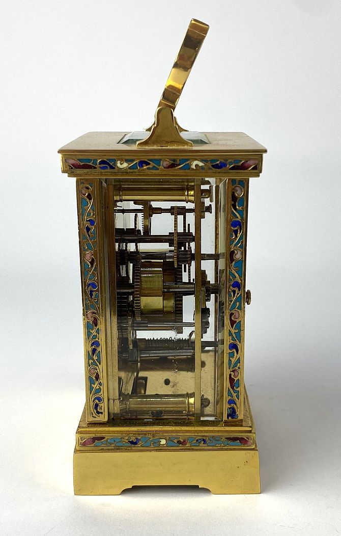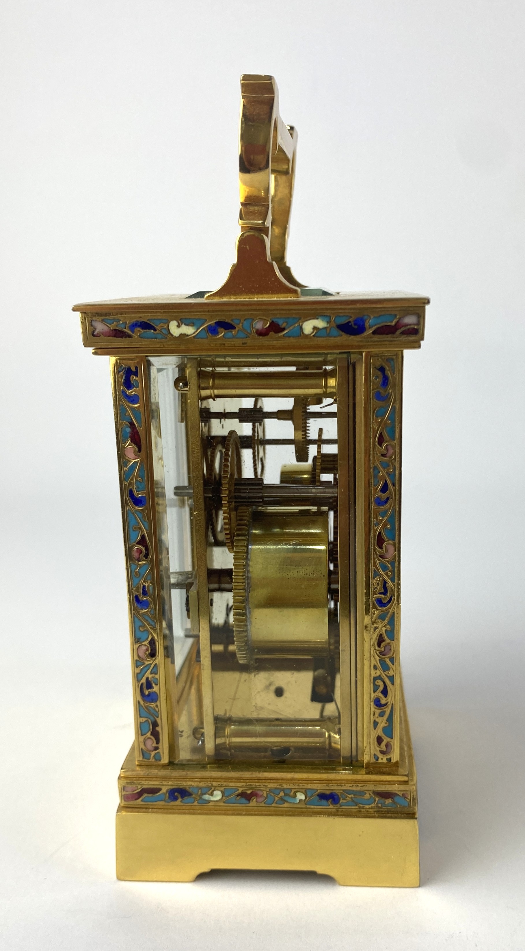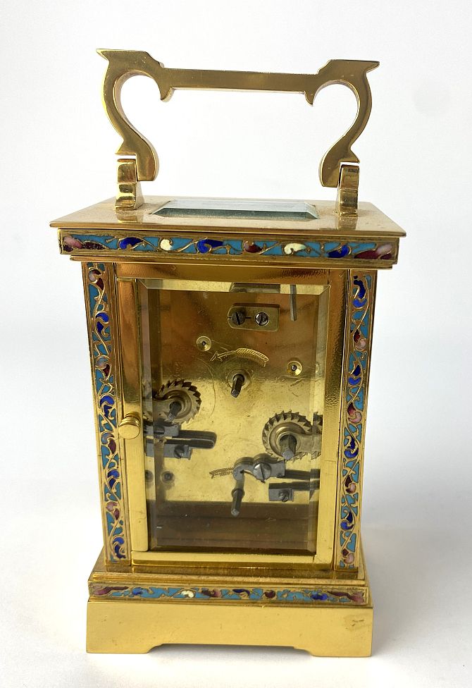 A gilt brass, cloisonne enamel and bevelled glass cased carriage clock, the unsigned dial having silvered chapter ring with Arabic numerals, 16cm high including handle, with key