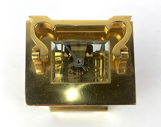 A gilt brass combination carriage timepiece, with clock, barometer and thermomet...