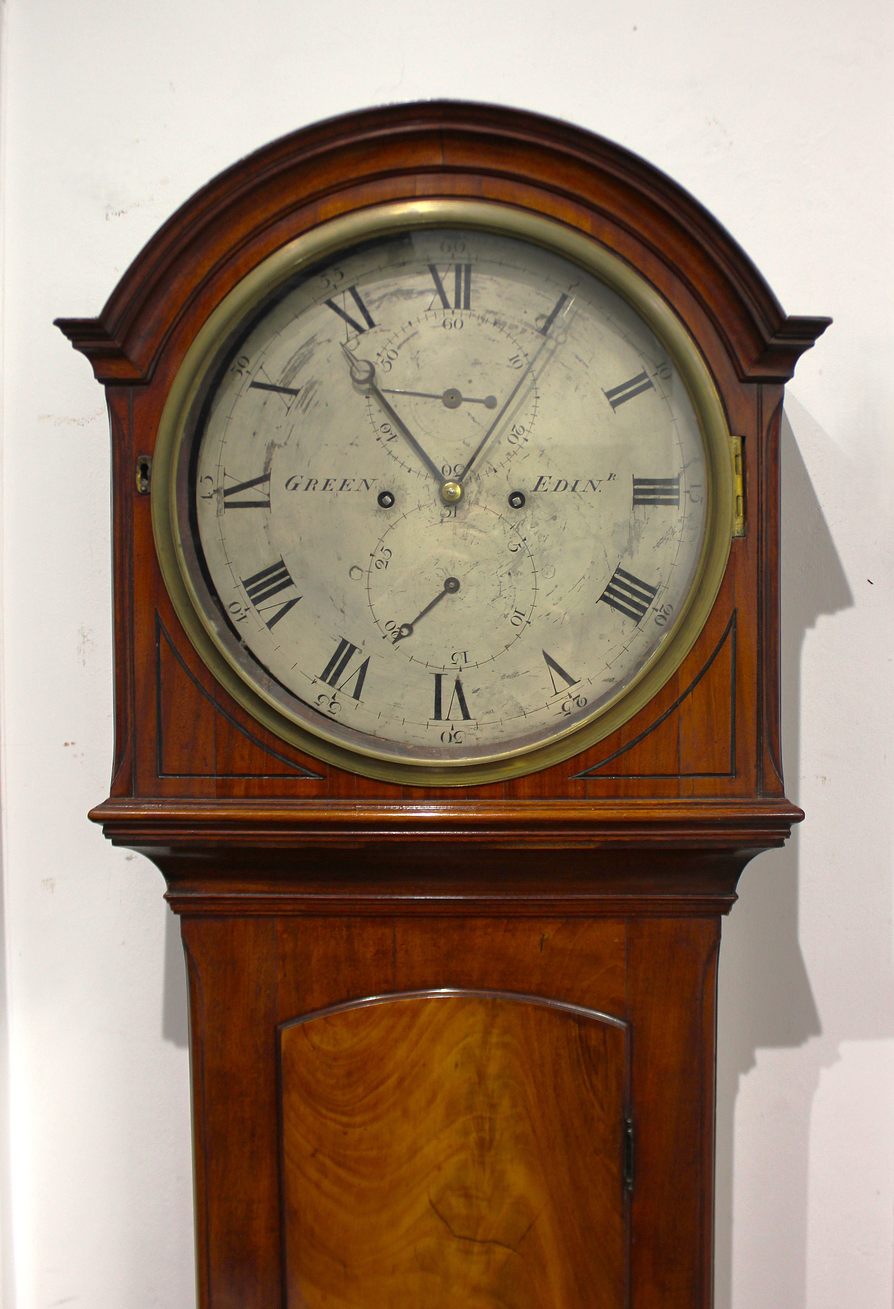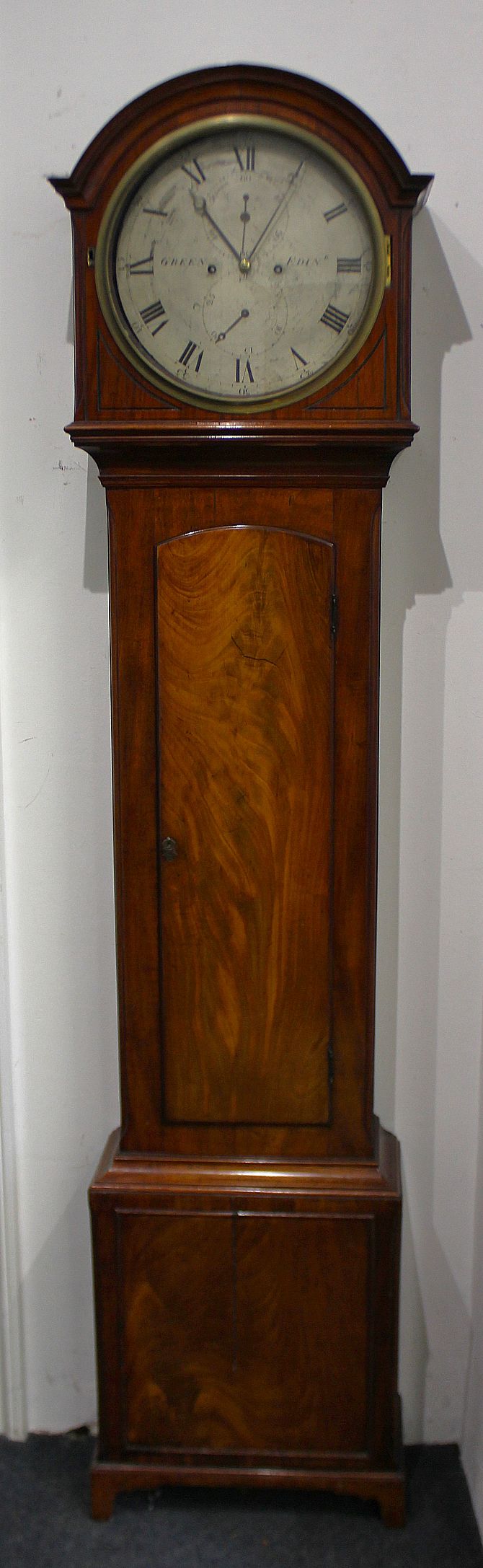 A Regency mahogany longcase clock by Green of Edinburgh, the twin train movement striking on a bell, the circular dial with subsidiary strike/silent lever, seconds and date dials, the arched hood over an arched trunk door on panelled base and bracket feet, 210cm high, with pendulum, weight, winding key and case key
