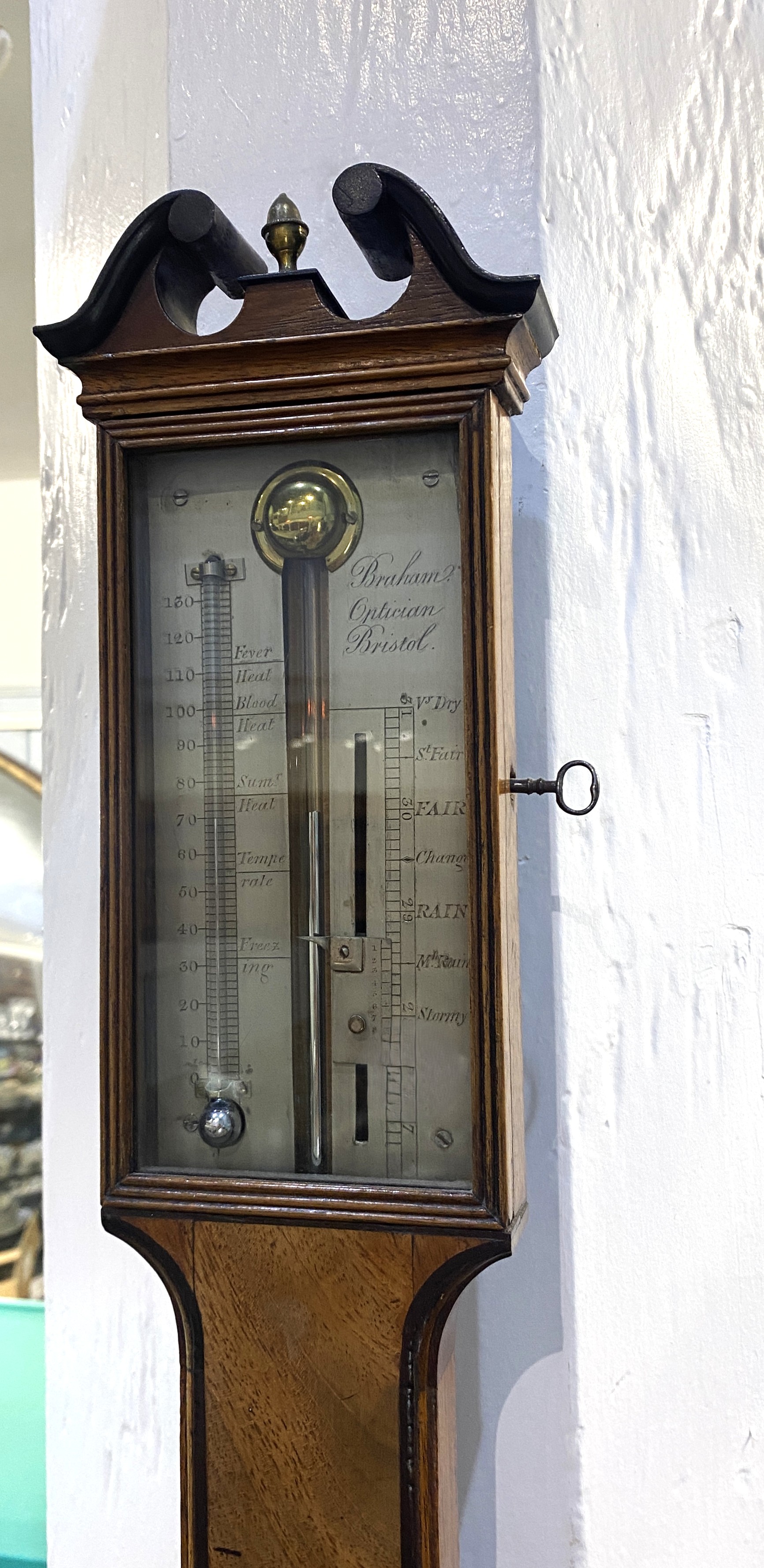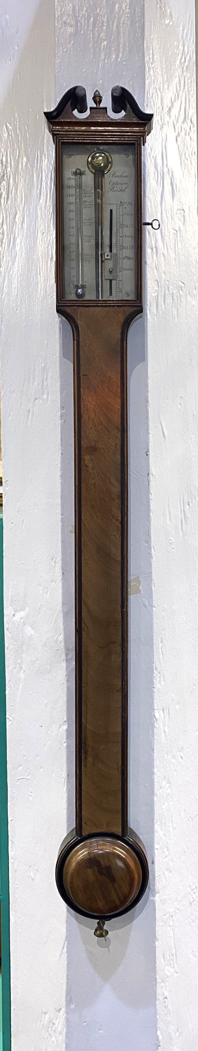 A George III mahogany mercury stick barometer, the case with swan neck pediment, inscribed 'Braham Optician Bristol' 99cm high, with key