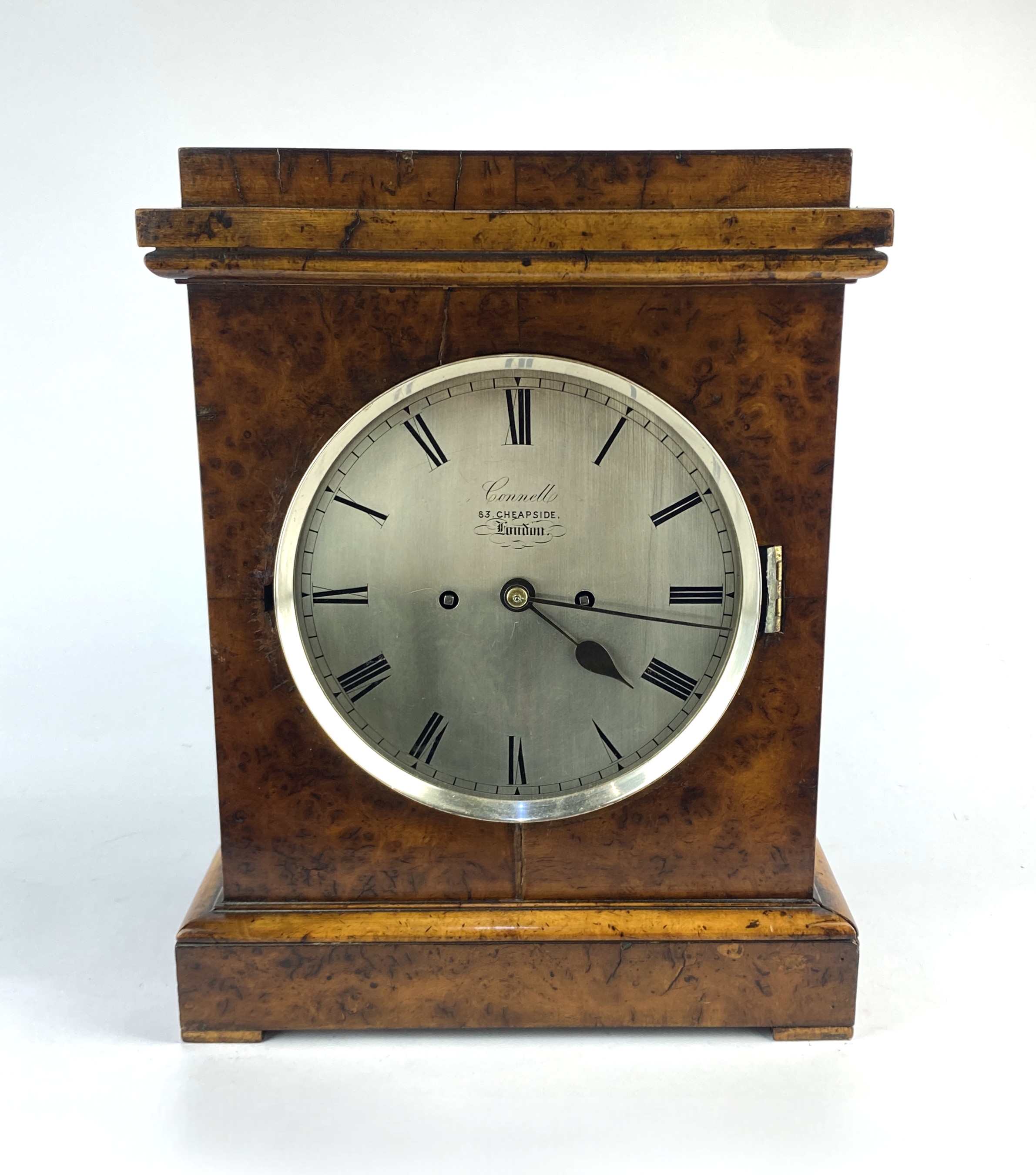 Connell, London, a walnut bracket clock the double-fusee movement striking on a bell, the 7 1/2 inch round silvered dial having black Roman numerals and signed Connell, 83 Cheapside, London, 39cm high, with pendulum and winding key, bezel detached but present, glass missing