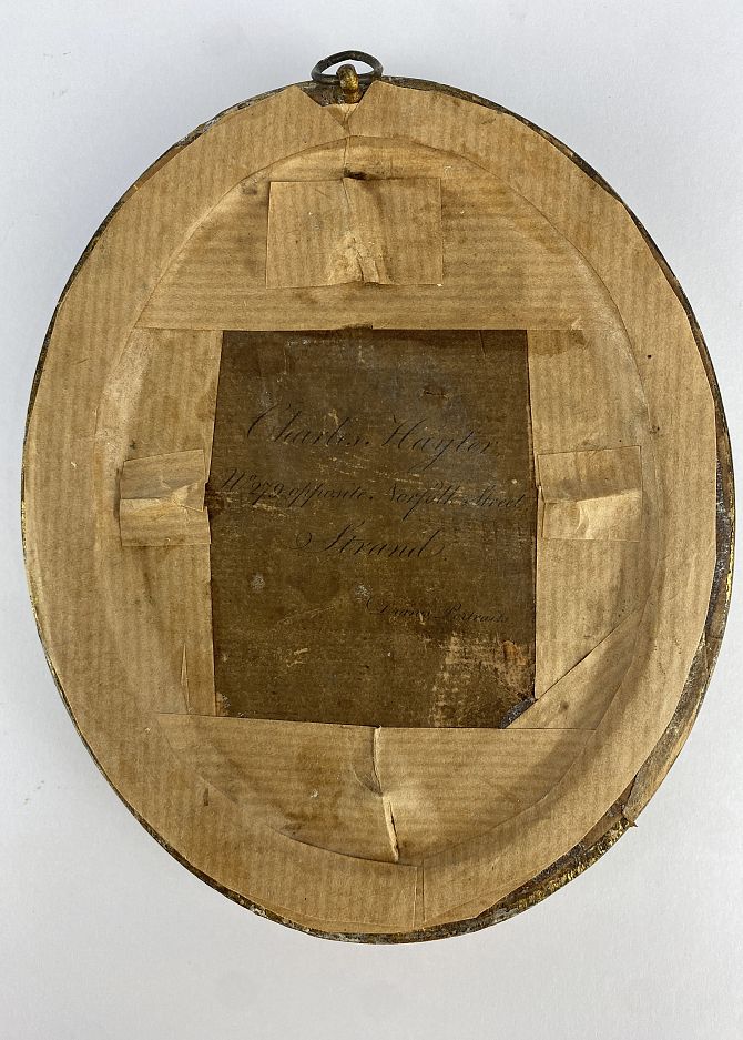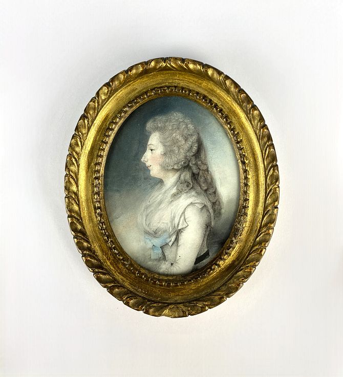 Manner of Charles Hayter (1761-1835), miniature profile portrait of a lady, pencil and watercolour on paper, unsigned, verso paper label for Charles Hayter, 11.5cm by 8.5cm