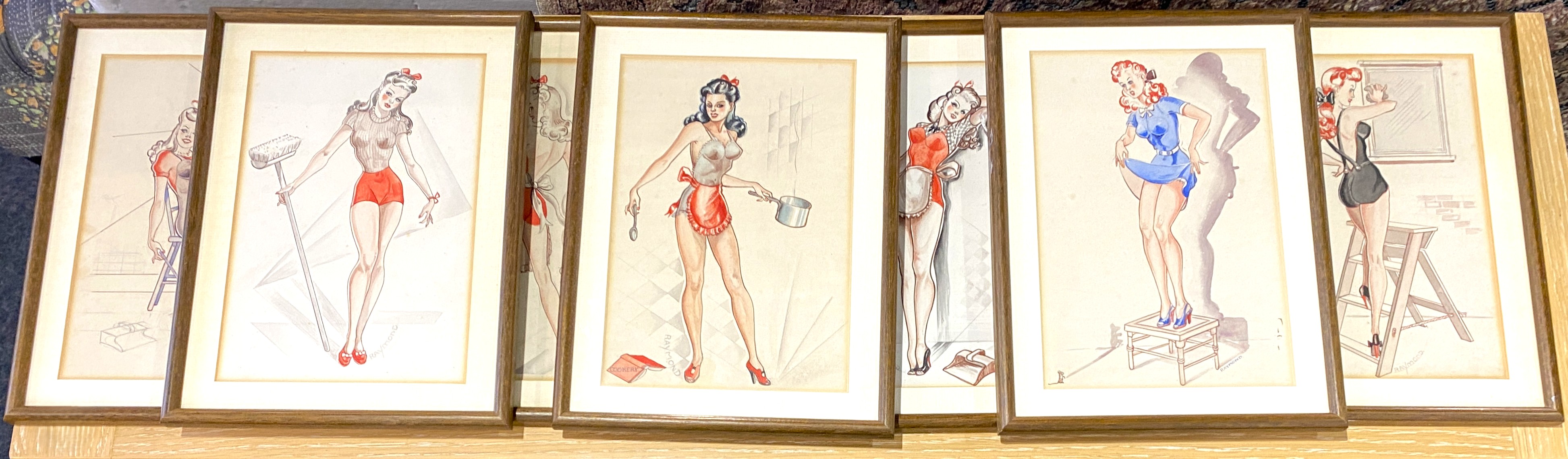 Raymond (20th century), a series of seven figurative watercolours depicting attractive young women in saucy outfits, six signed, 24cm by 17cm, framed, (7).