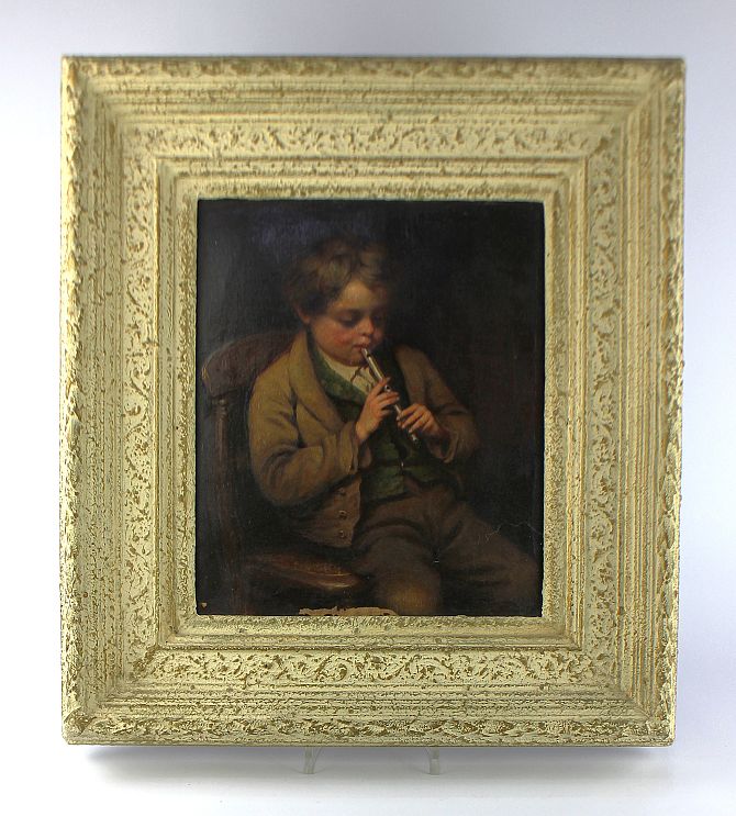 British School (19th century), 'Boy with a flute', oil on canvas, 29cm by 24cm, framed, (af - some paint loss).