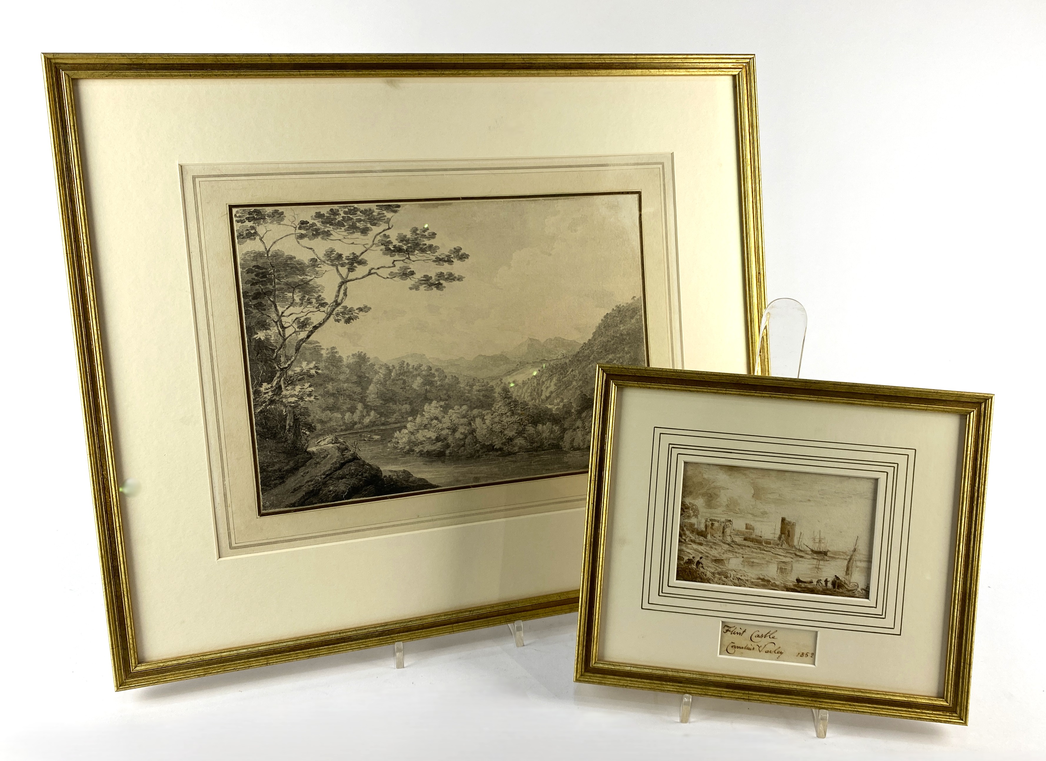 Cornelius Varley (1781-1873), Flint Castle, sepia watercolour, inscribed and dated 1852, 8cm by 12.5cm, together with Manner of Thomas Hearn (1744-1817), landscape, monochrome watercolour, unsigned, 20.5cm by 29cm (2)