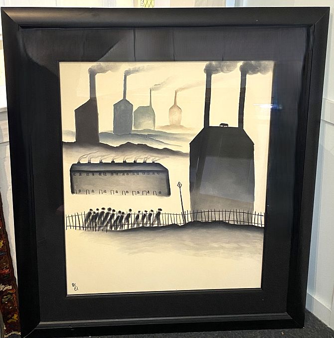 Mackenzie Thorpe (British, b.1956), 'To Work' depicting a Northern School Industrial landscape, pastel, signed with monogram, 82cm by 68cm, framed.