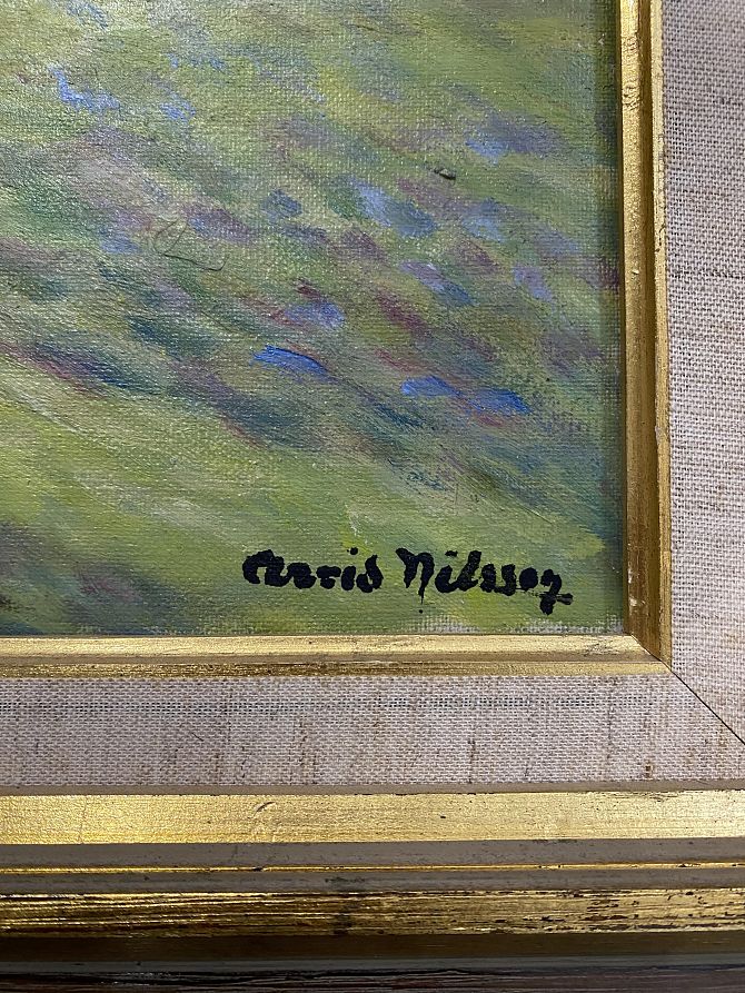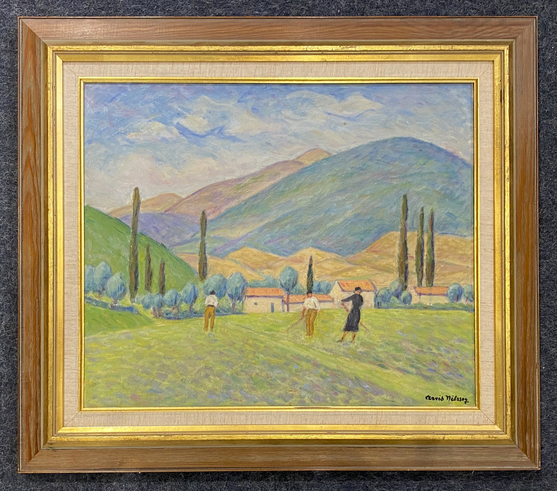 Arvid Nilsson (Swedish, 1881 - 1971), 'Field workers near a mountain village', oil on canvas, signed, inscribed verso, 45cm by 55cm, framed.