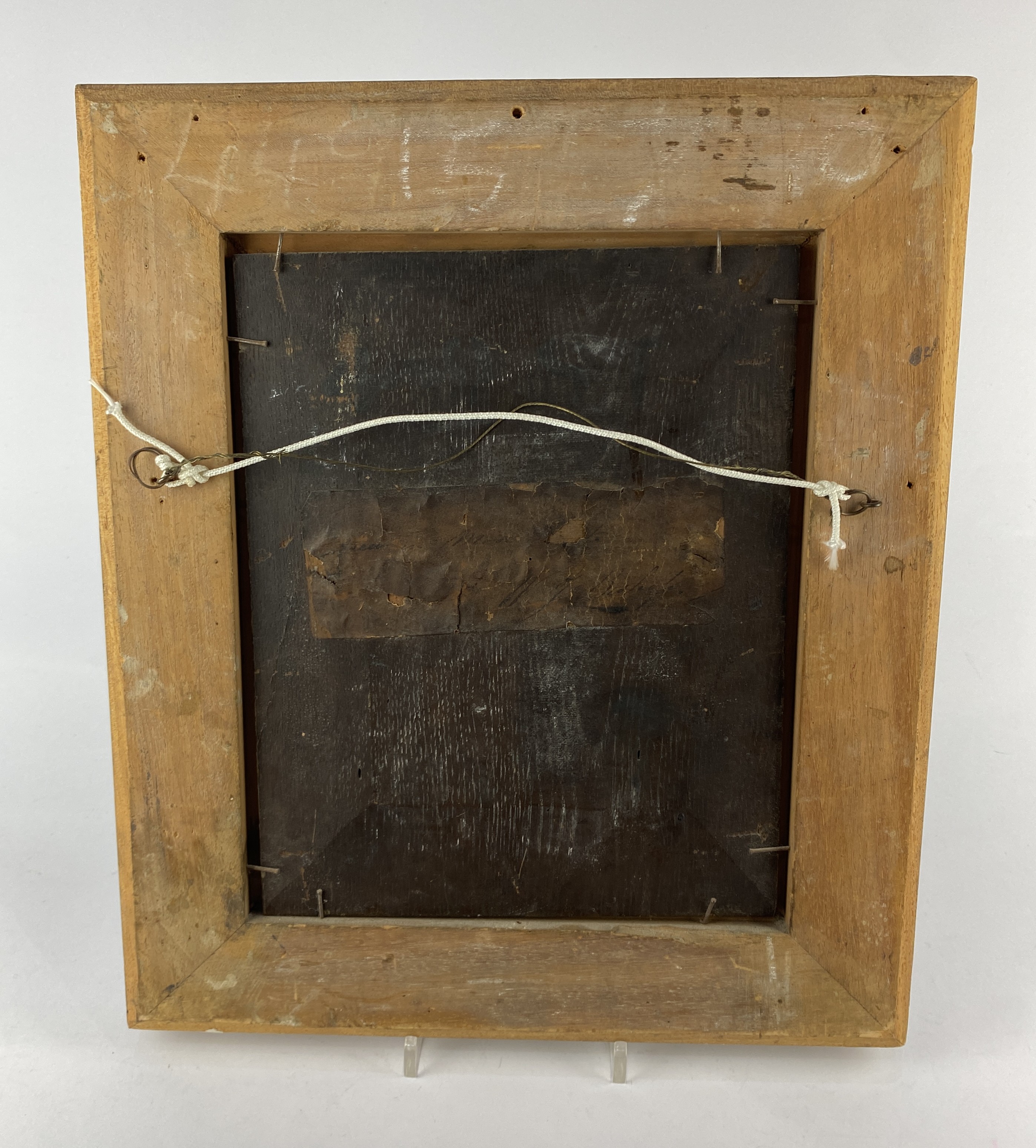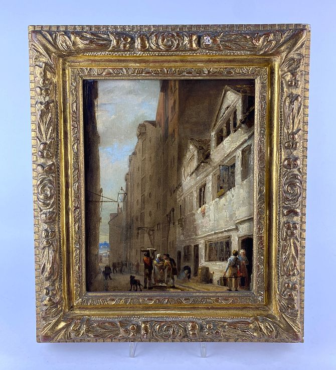 18th century school, street scene with figures, oil on panel, unsigned, verso paper label indistinctly inscribed, 26cm by 20.5cm