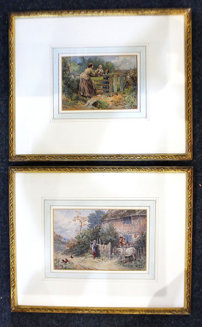 Follower of Myles Birket Foster (1825-1899), mother, daughter and donkey outside a cottage, lithograph, bearing monogram for Birket Foster and signature 'MH Long', 14cm by 21cm and another similar lithograph depicting a woman and two children at a gate, 12cm by 17cm (2)