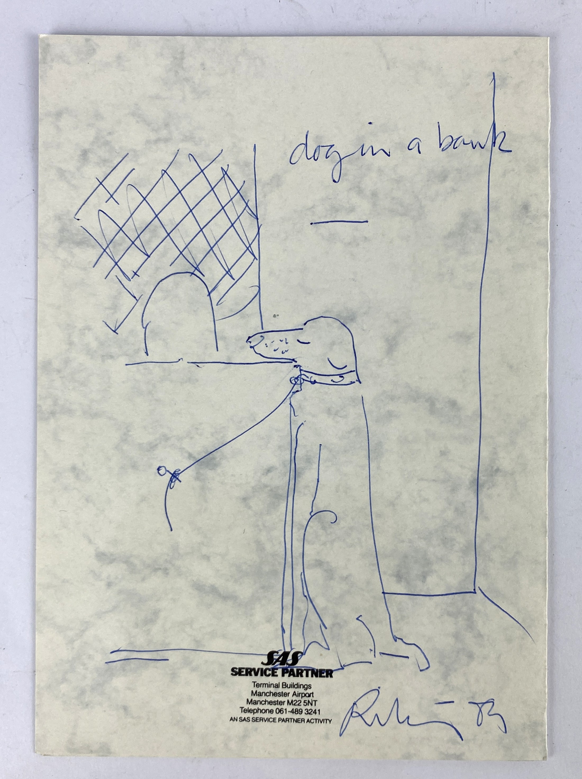 Harold Riley (British, 1934-2023), 'Dog in a bank', blue biro sketch on the back of a menu, 'The Gordon Thomas Suite, Manchester Airport Christmas Dinner, Saturday 9th December 1989', signed, 21cm by 15cm.