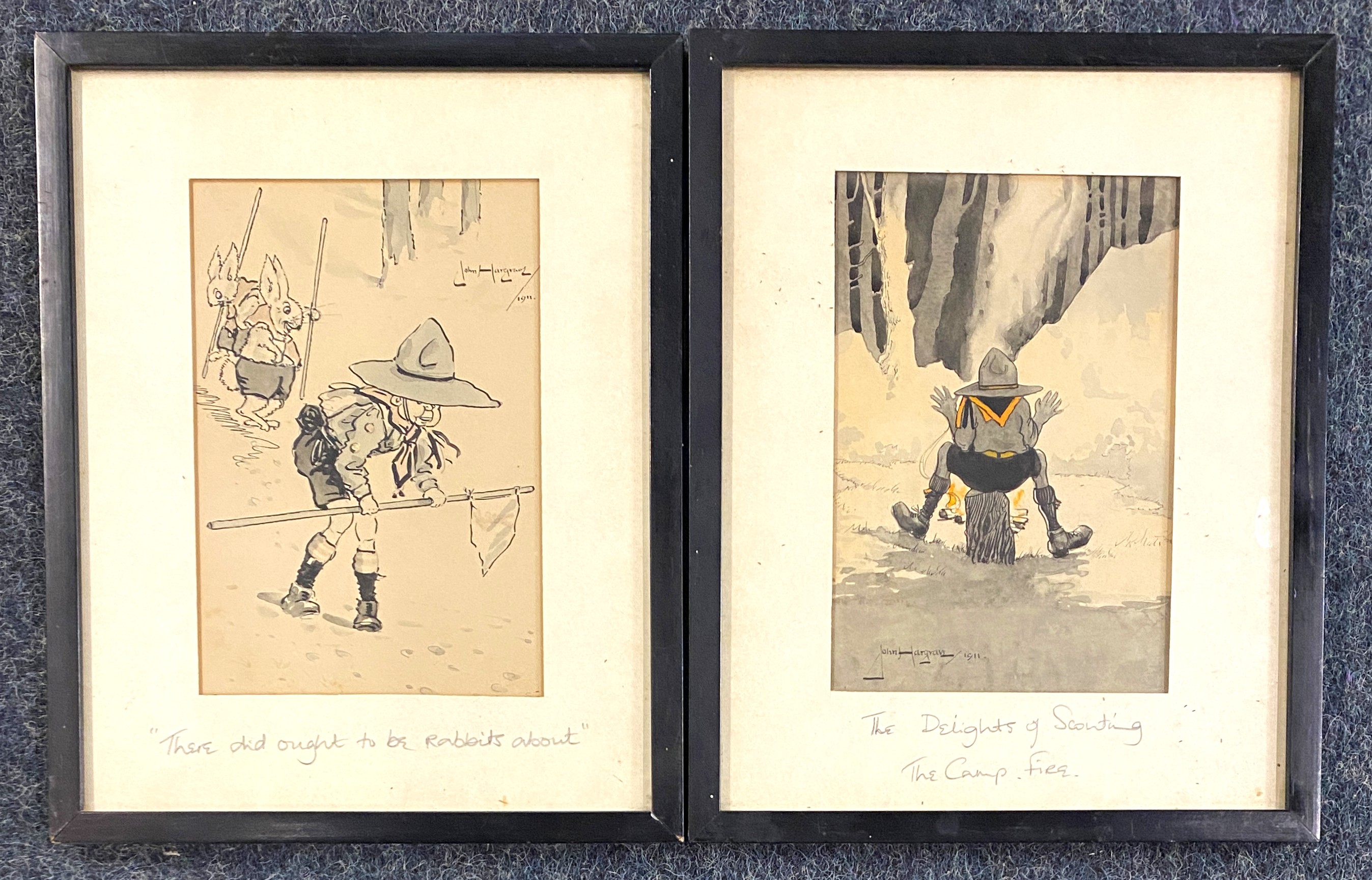 John Hargrave (1894 - 1982), 'The Delights of Scouting, The Camp Fire' and 'There did ought to be rabbits about', two boy scout ink and watercolour drawings, signed and dated 1911, 20cm by 14cm, framed, (2).