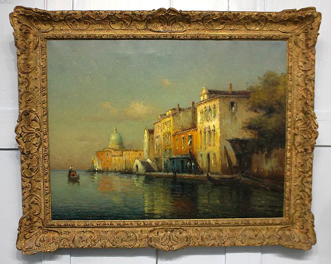 Antoine Bouvard (French, 1870 - 1956), 'Venice canal scene', oil on canvas, signed 'Bouvard', label verso for Harrods Picture Department, Knightsbridge, London, 50cm by 65cm, framed.