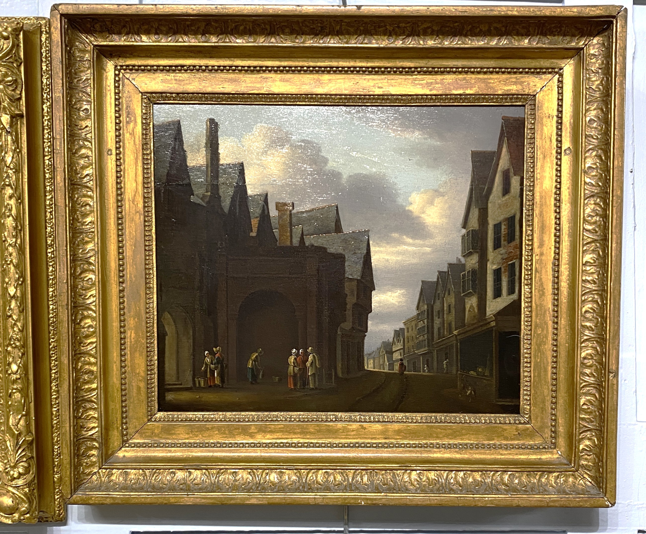 18th century Dutch school, street scene with figures, oil on panel, unsigned, 29.5cm by 35.5cm
