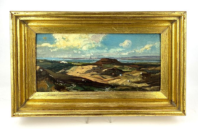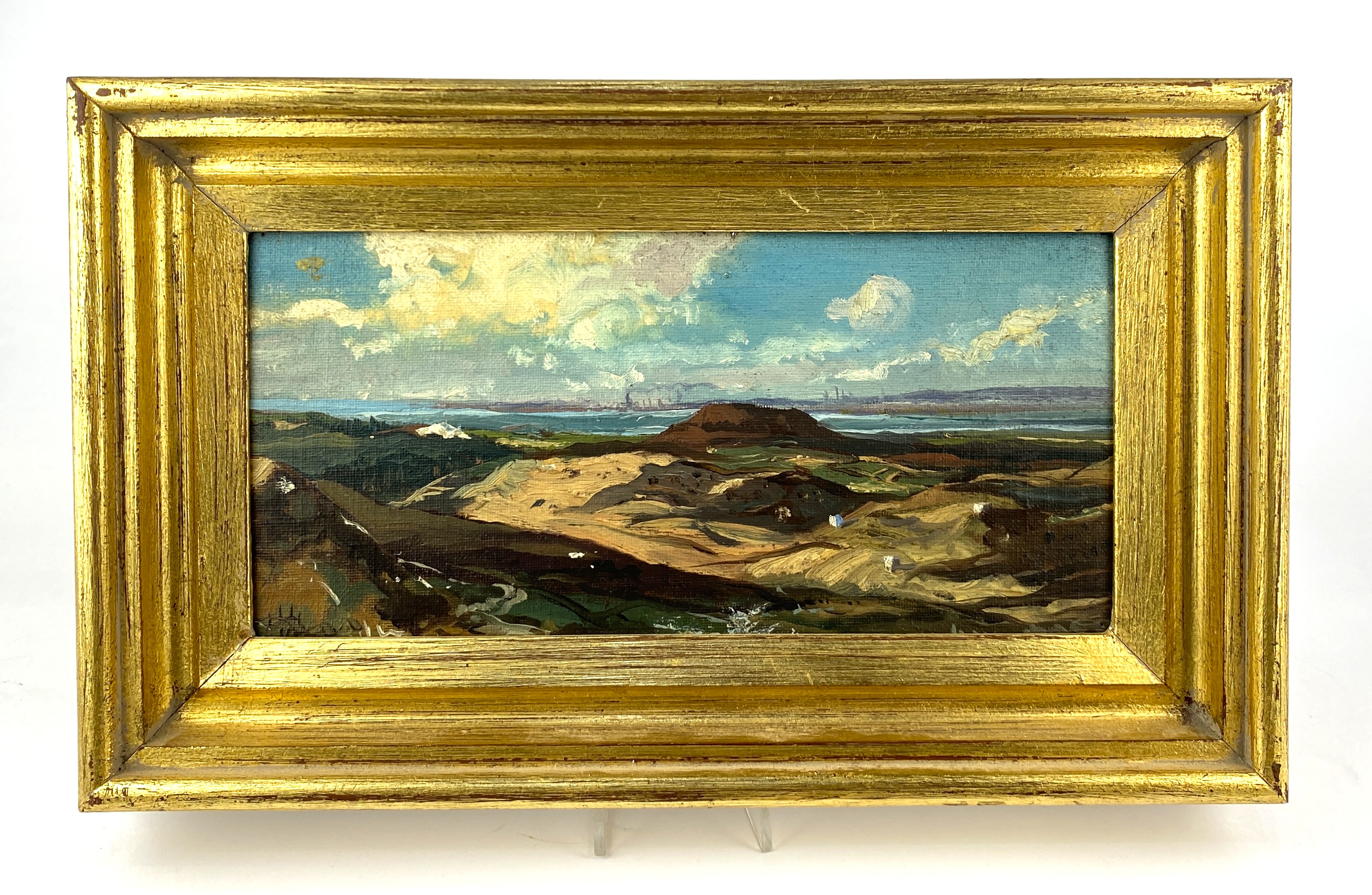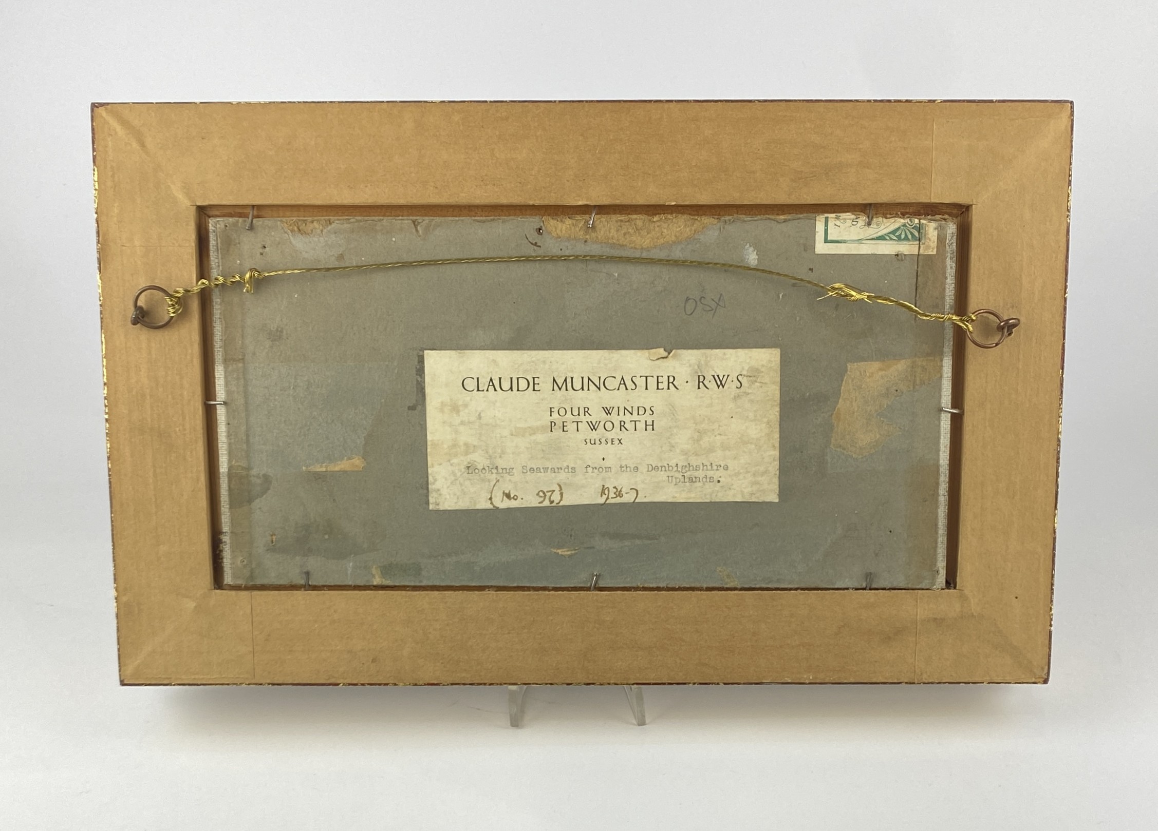 Claude Grahame Muncaster (1903-1974), 'Looking seawards from the Denbyshire Uplands', oil on board, verso artist's label, 12cm by 25cm