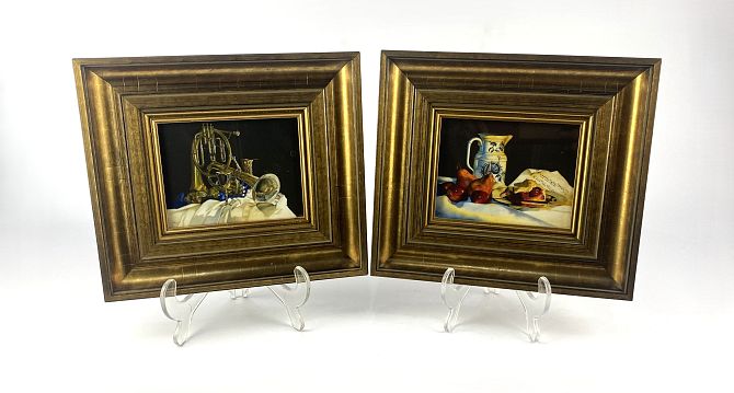 Elaine H Fellows RMS HS (20th century), 'Silver Mark' and 'Red Williams', a pair of miniature paintings, monogramed and dated (19)95, with gallery labels verso for Llewellyn Alexander (Fine Art) Ltd, 124-126 The Cut, Waterloo, London, SE1 8LN, (opposite the Old Vic Theatre), 9cm by 11.5cm, matching frames.
