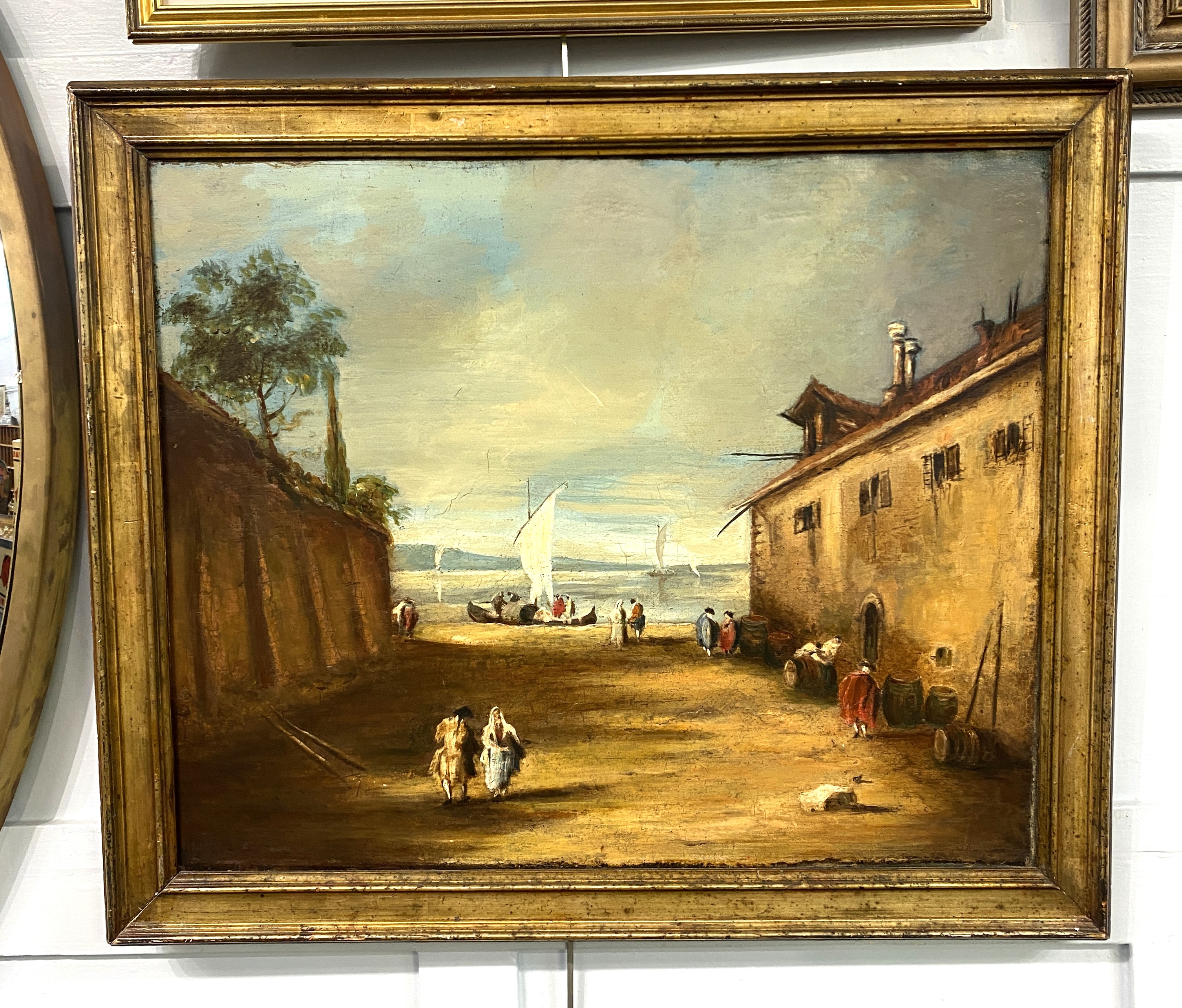 19th century Continental school, Mediterranean figures and quay, oil on canvas, unsigned, 49cm by 59cm