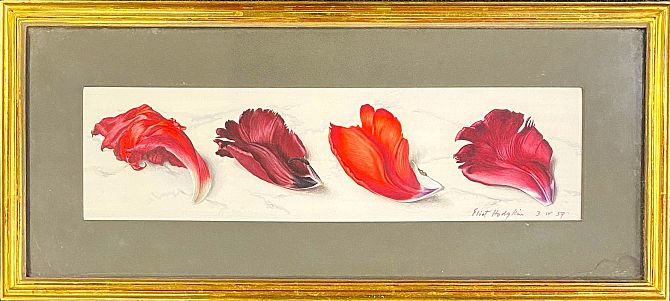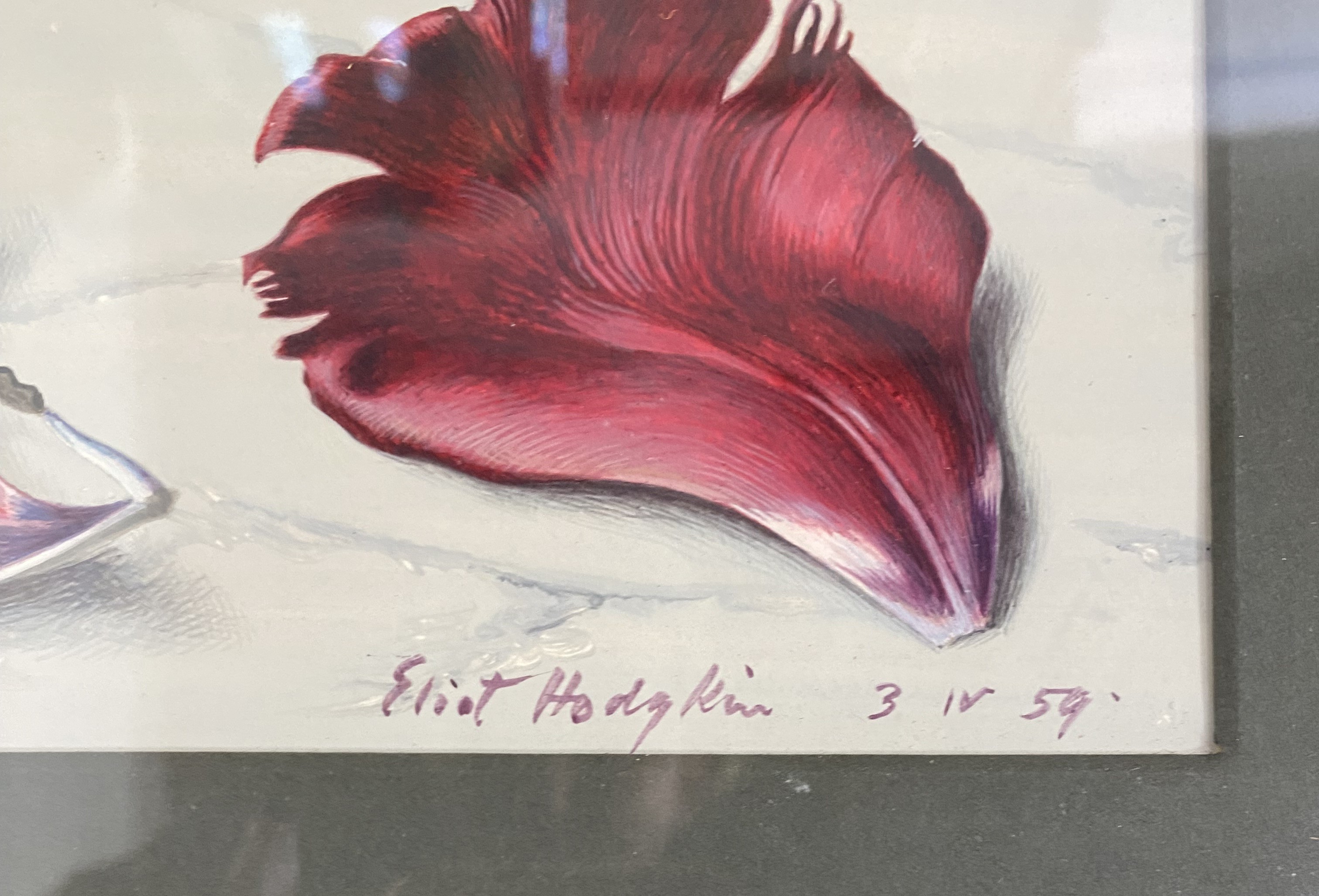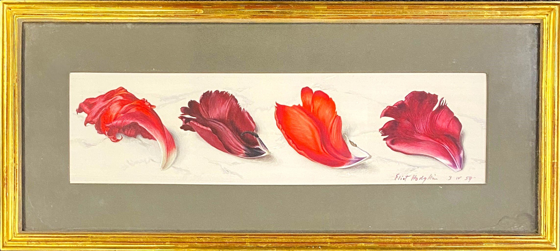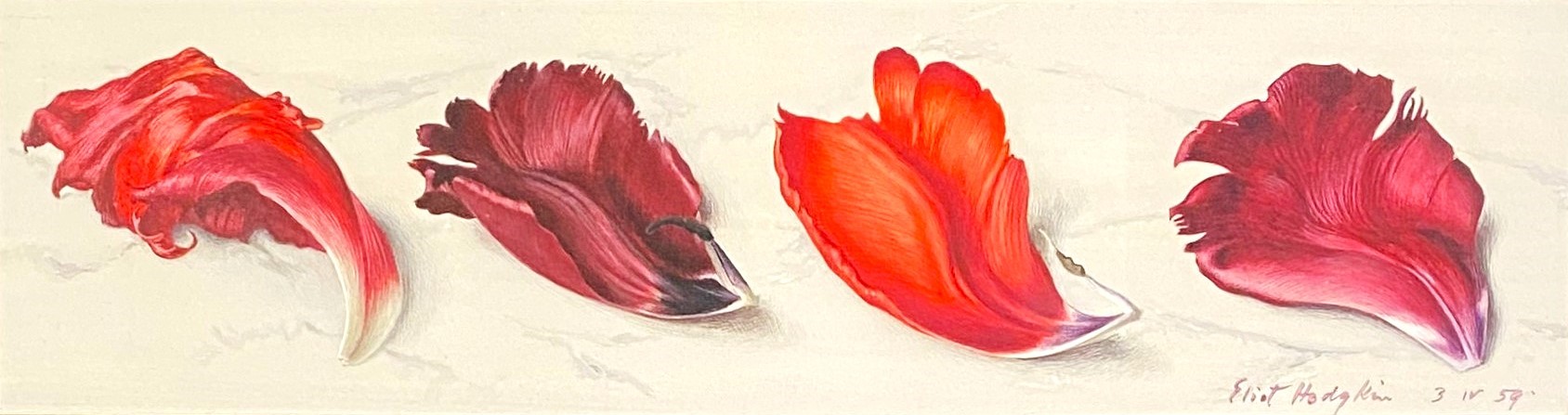 Eliot Hodgkin (1905-1987), Four Red Tulip Petals, tempera, signed and dated ‘3 IV 59’, verso paper label for The Arthur Jeffress Gallery, 10.5cm by 40cm provenance: Arthur Jeffress Gallery and thence by family descent, listed on the Eliot Hodgkin family website for the future catalogue raisonne https://www.eliothodgkin.com/work/four-red-tulip-petals/ (ARR)