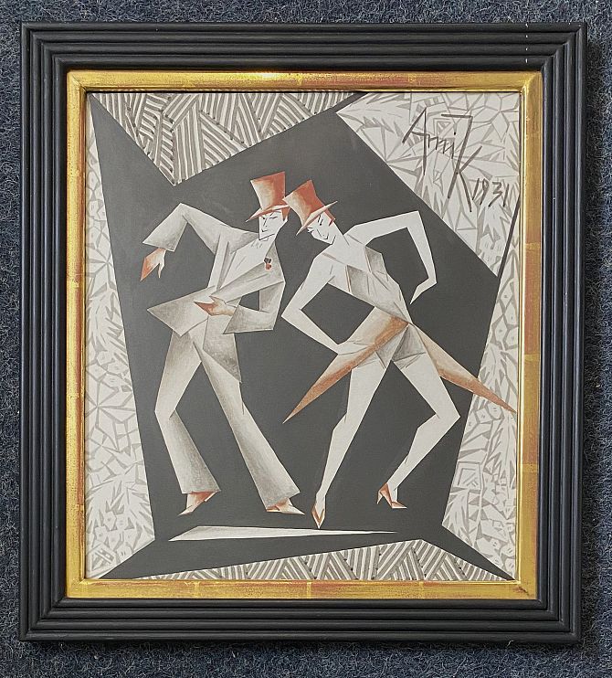Ami Karina, also known as Amelie Zimmerdahl, (1898 - 1979), 'Dancers in Red Top Hats', 1931, an Art Deco watercolour and ink work on paper, signed and dated '1931', label verso for the Roy Miles Gallery, 29 Bruton Street, London, 35cm by 31cm, framed.