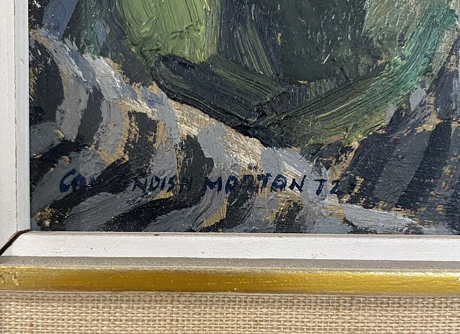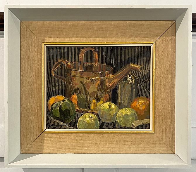 Cavendish Morton (1911 - 2015), 'Still life depicting a watering can and fruits', oil on board, signed and dated (19)72, 19cm by 24cm, framed.