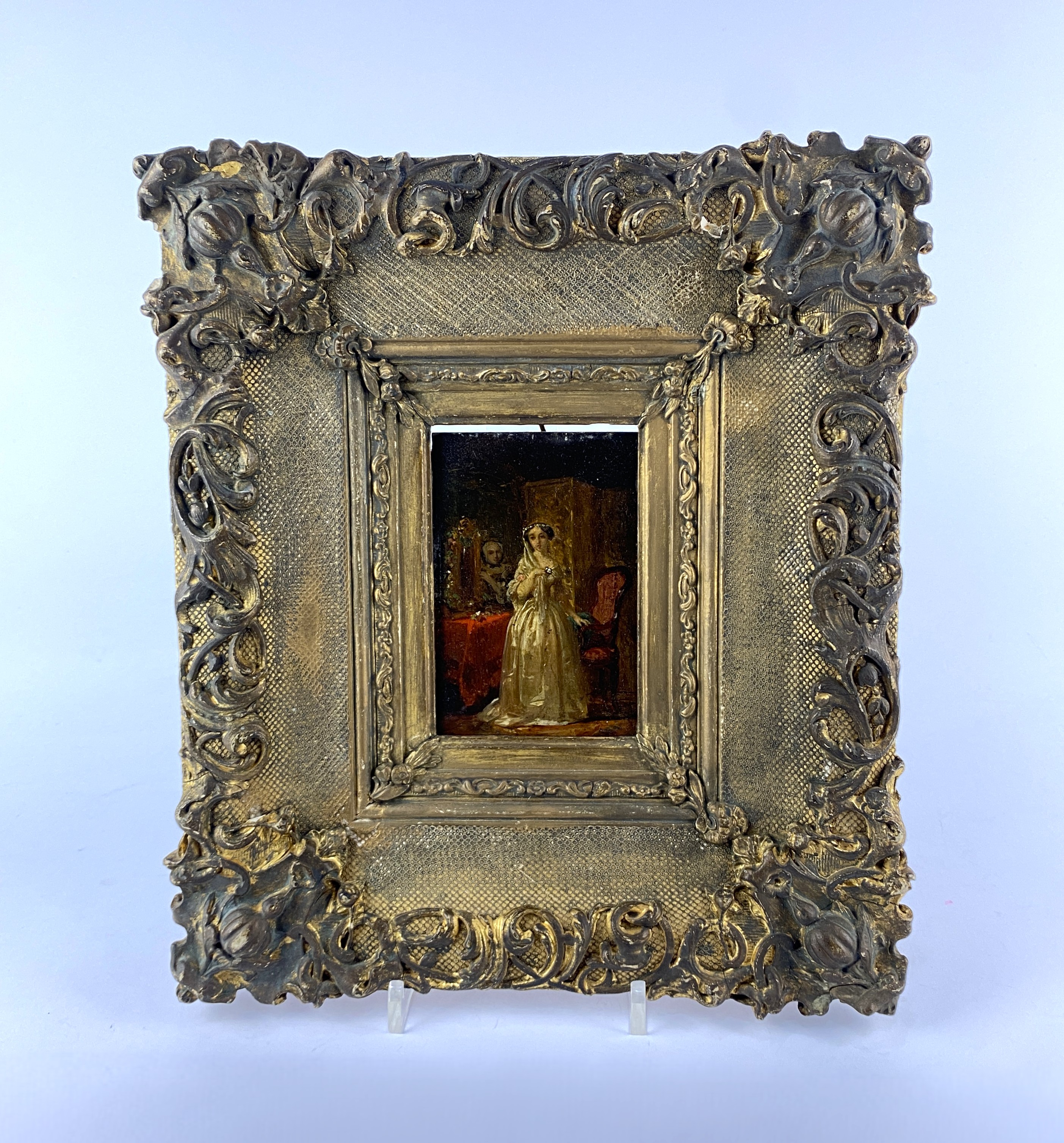 19th century school, portrait of a lady in wedding attire, oil on panel, indistinctly initialled RN?, verso faintly inscribed in ink, 10.5cm by 7.5cm