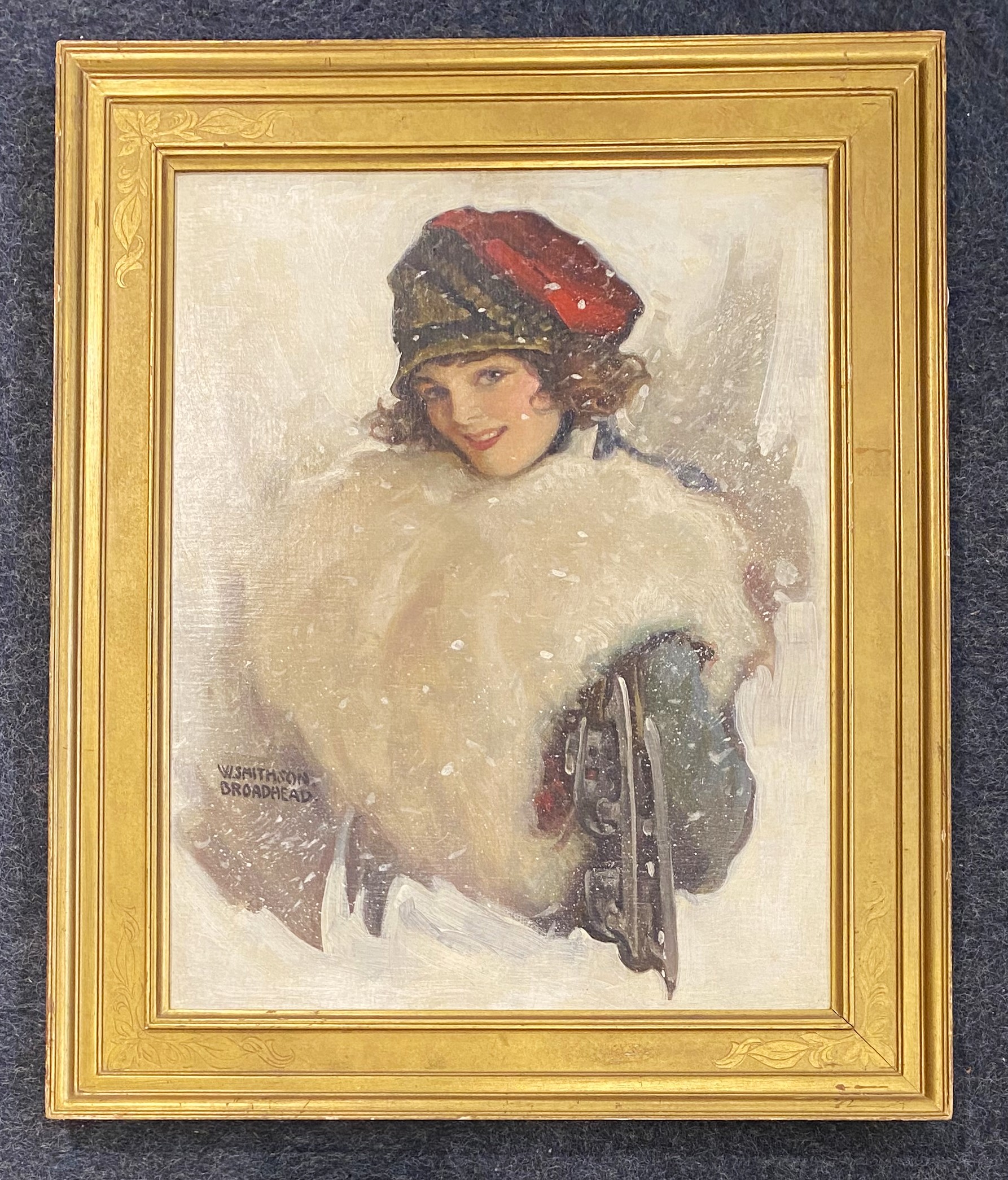 W Smithson Broadhead (1888 - 1960), 'Study of an attractive young woman in snow', oil on board, signed, 58cm by 45cm, framed.