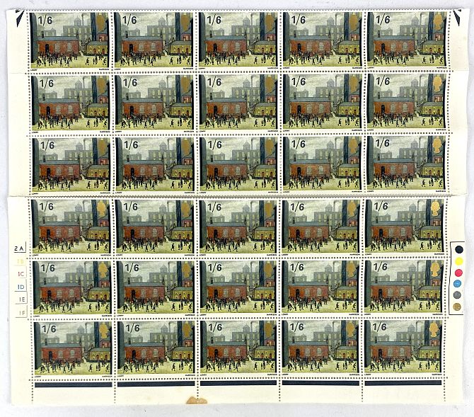 Two sheets of fifteen uncirculated L S Lowry stamps (thirty stamps in total).