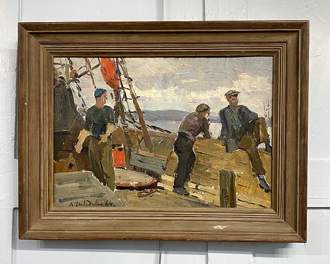 Lidia Davidenkova (Russian b 1939), Three Sailors, oil on canvas, signed and dated 64, verso inscribed, 33cm by 48cm, with photocopied Lacy Gallery receipt