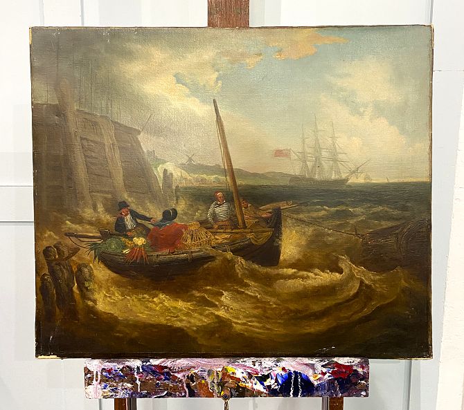19th century maritime school, boats on stormy coastal waters, rowing boat in the foreground, oil on canvas (relined and restored), unsigned, 64cm by 76cm, unframed