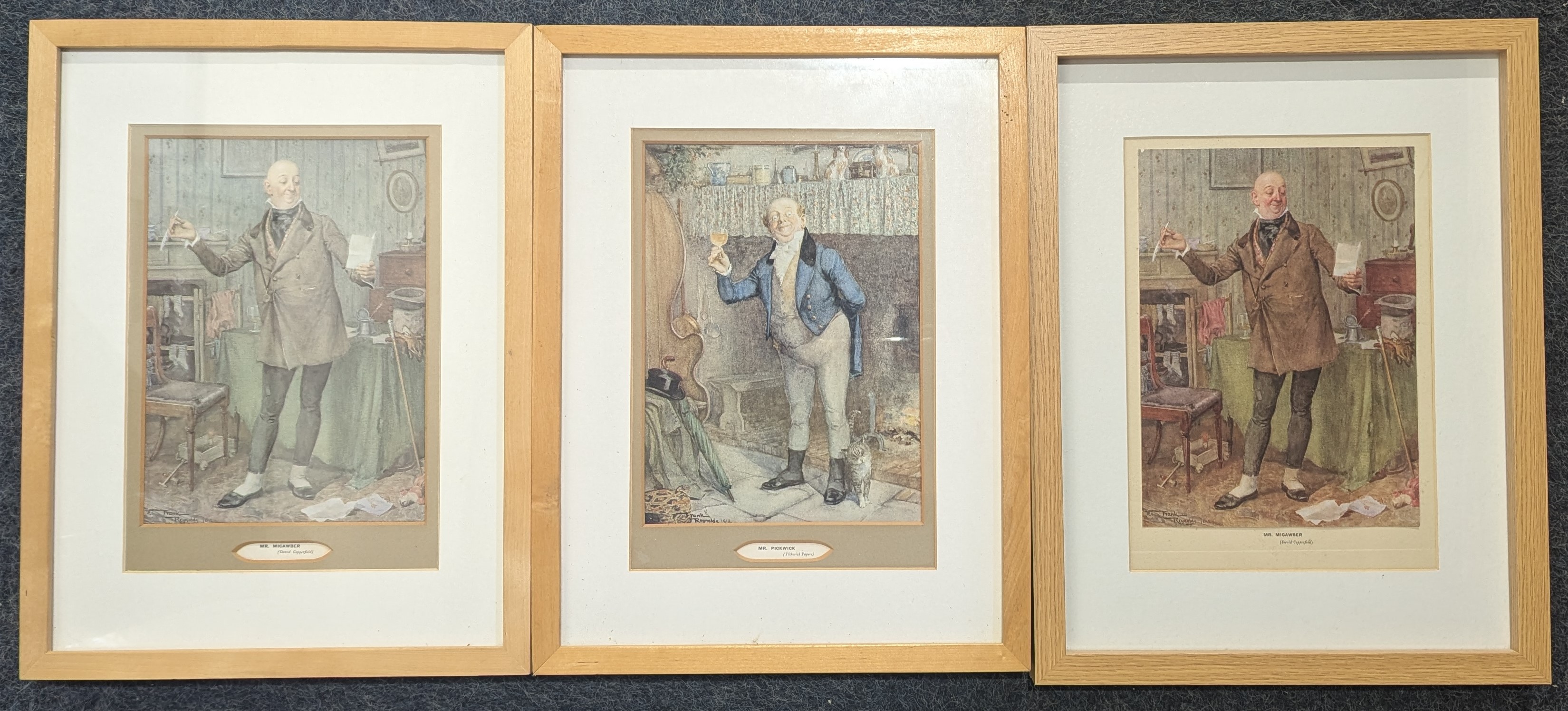 After Frank Reynolds (1876 - 1953), three colour prints depicting Charles Dickens characters comprising two Mr Micawber (David Copperfield) and one Mr Pickwick (Pickwick Papers), 28.5cm by 20cm