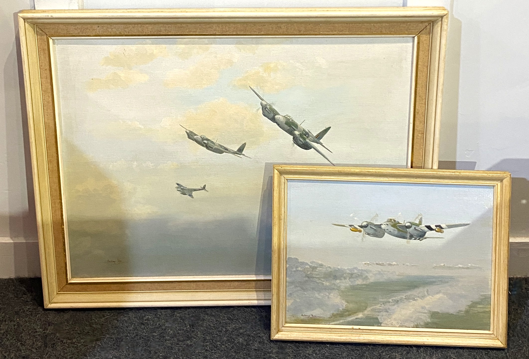 Anthony Payn (20th century), 'Peeling Off' (D H Mosquito FB VI), oil on board, signed, hand written label verso, 44cm by 60cm, framed, together with 'Lone Ranger', oil on board, signed, hand written label verso, 25cm by 35cm, framed, (2).
