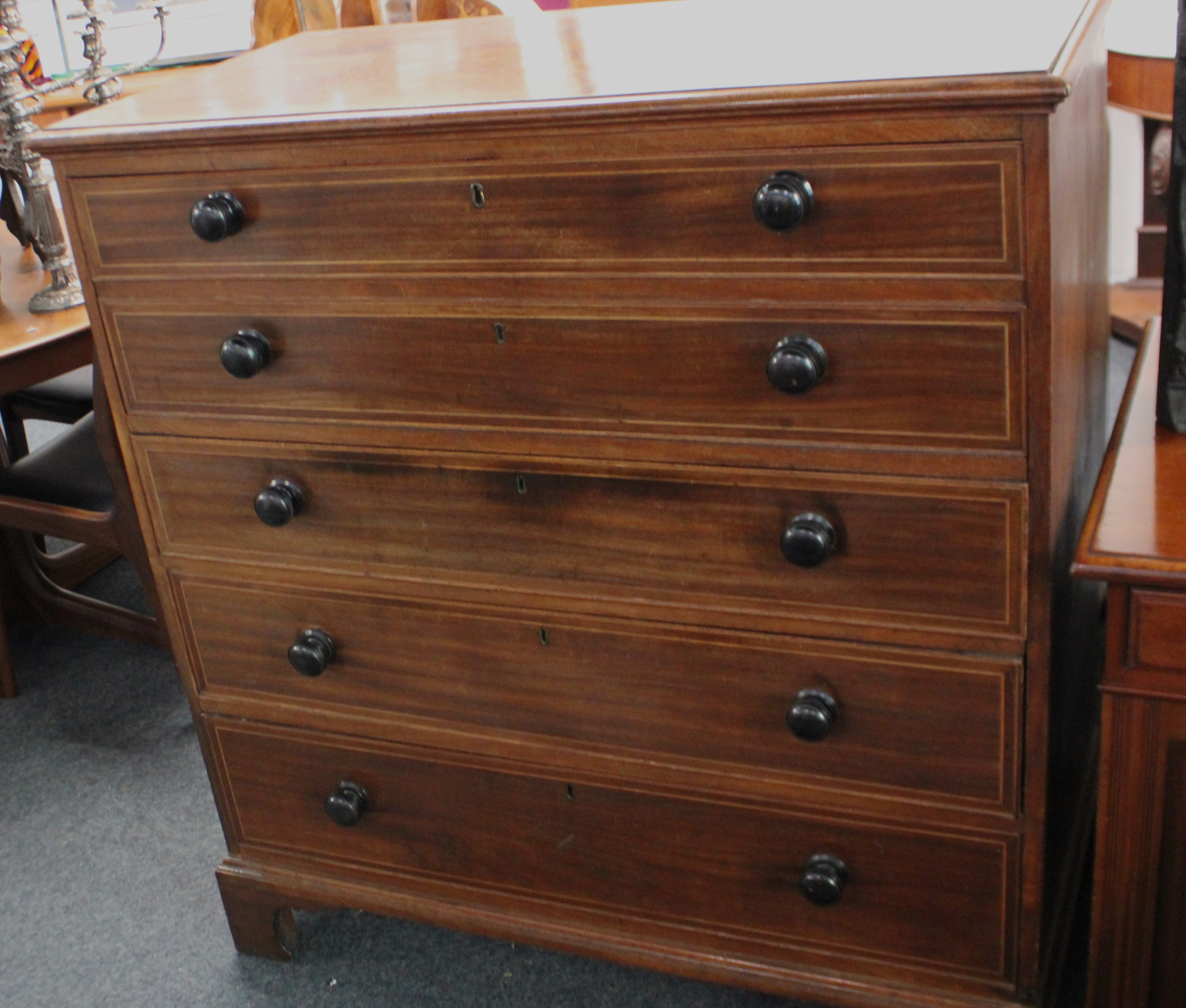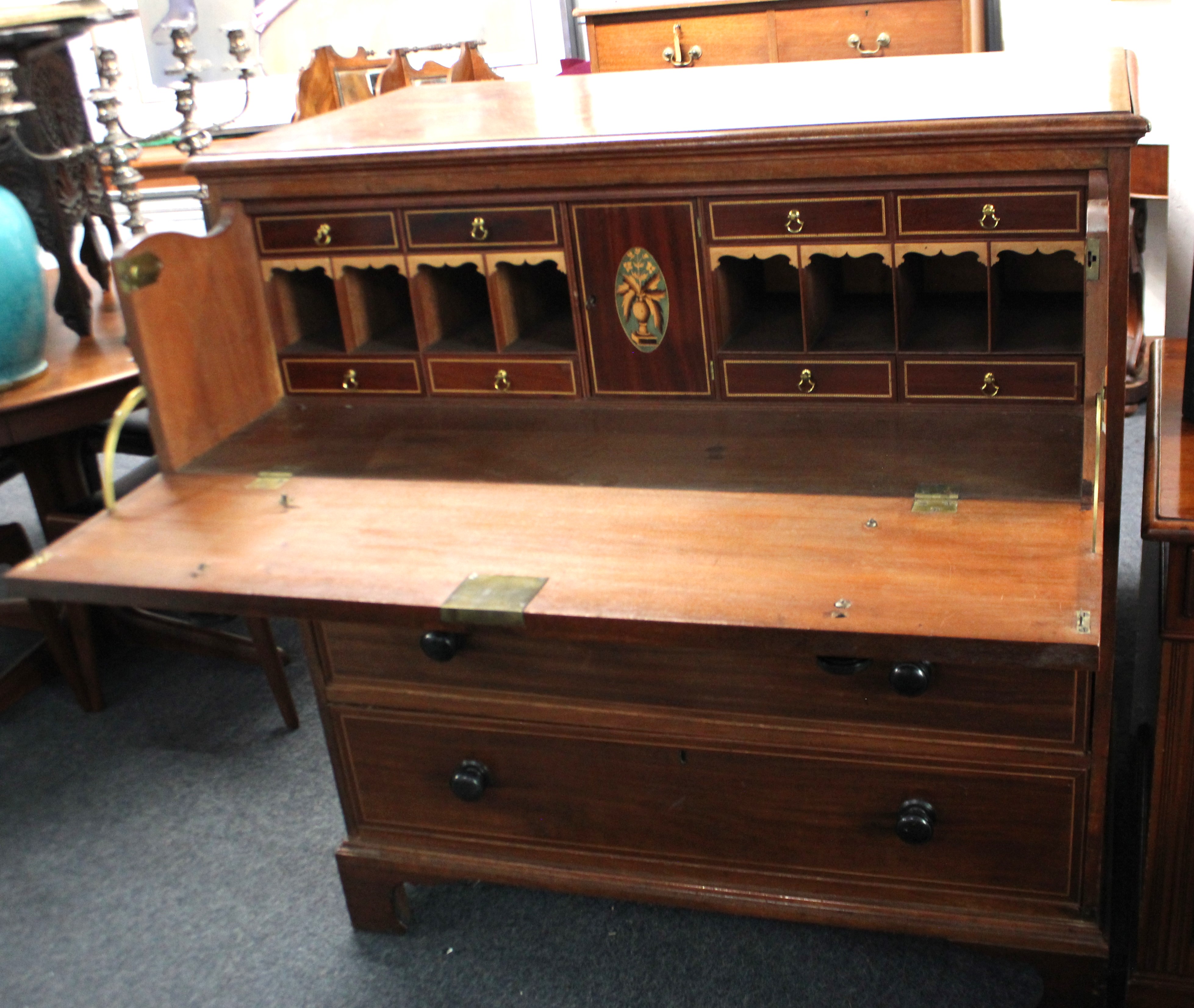 A 19th century mahogany secretaire chest inlaid with boxwood stringing, the two dummy upper drawers hinged to reveal a crisp marquetry inlaid fitted interior, above three long graduated drawers, raised on bracket feet, 110cm wide by 60cm deep by 116cm high.