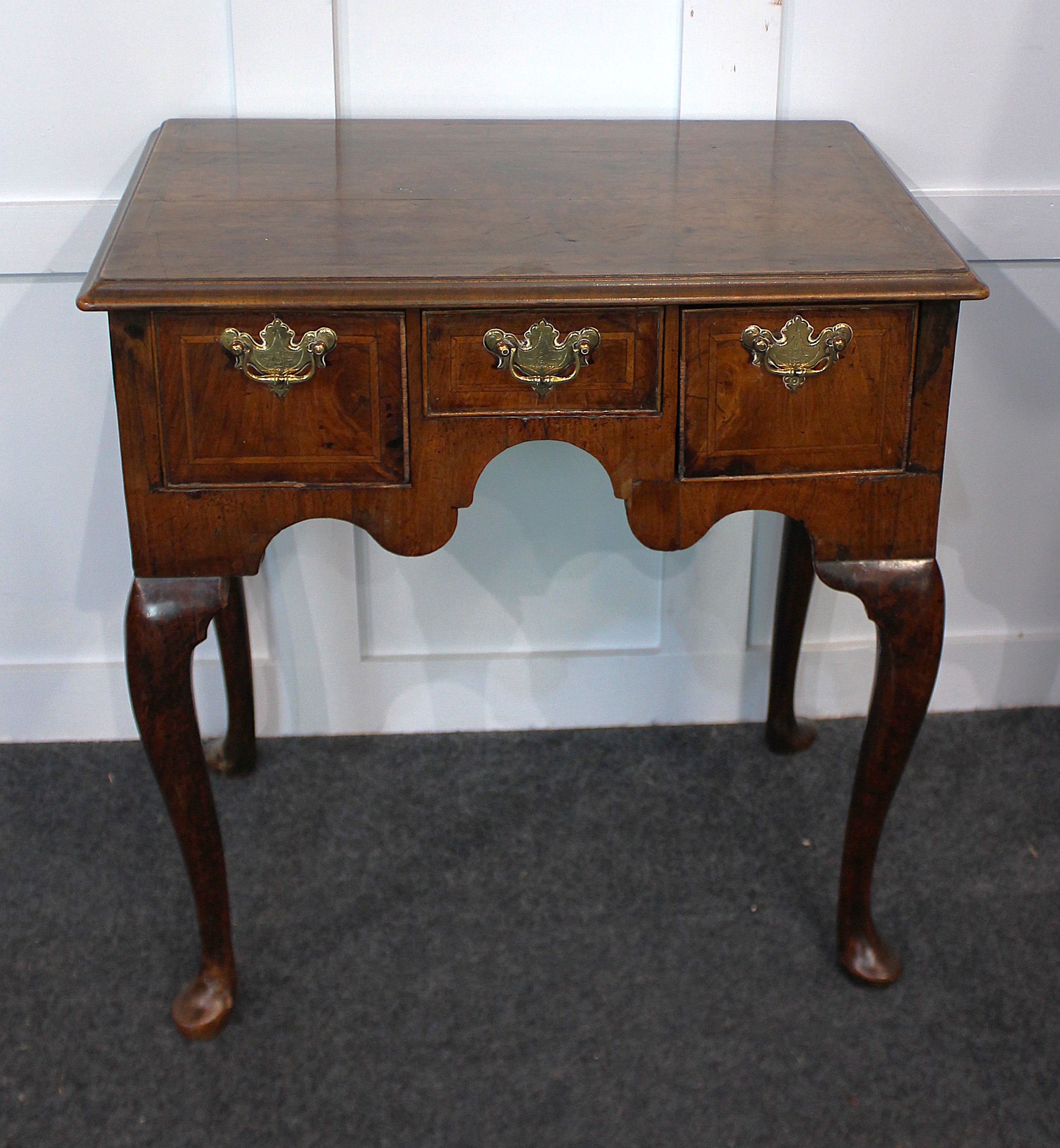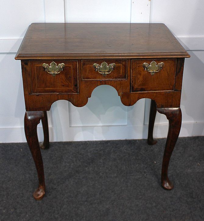 A George II walnut Lowboy with herringbone inlay, three oak lined drawers, raised on padfoot supports, 68cm wide by 45cm deep by 72cm high.